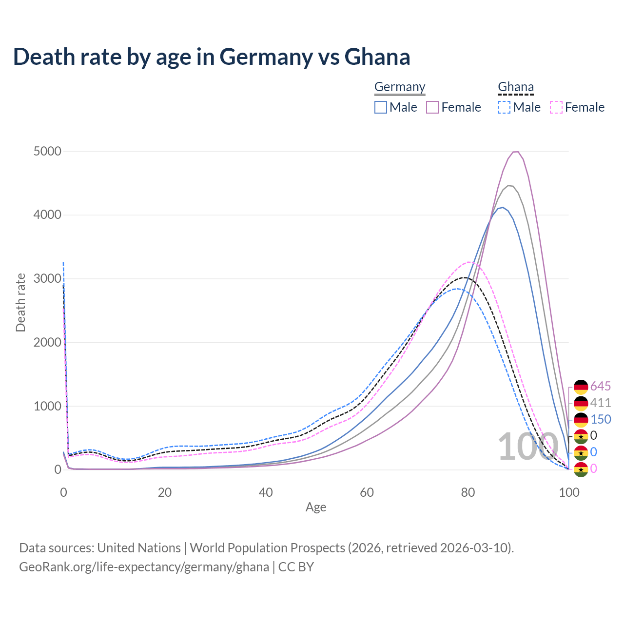 Note that this chart does not show rates per 100,000 population, as those would be skewed by age structure differences and reflect the demographics of Germany and Ghana more than their death rates.