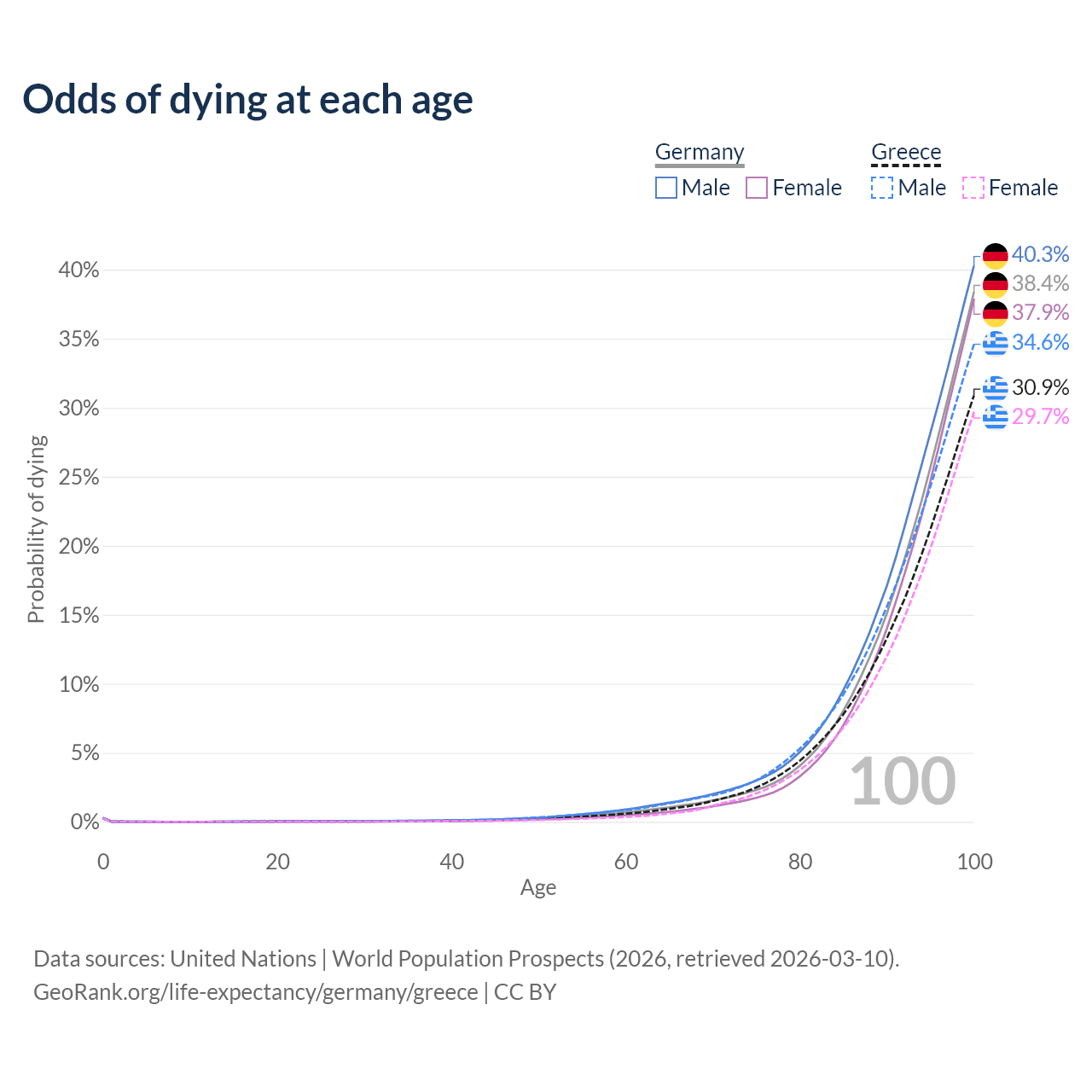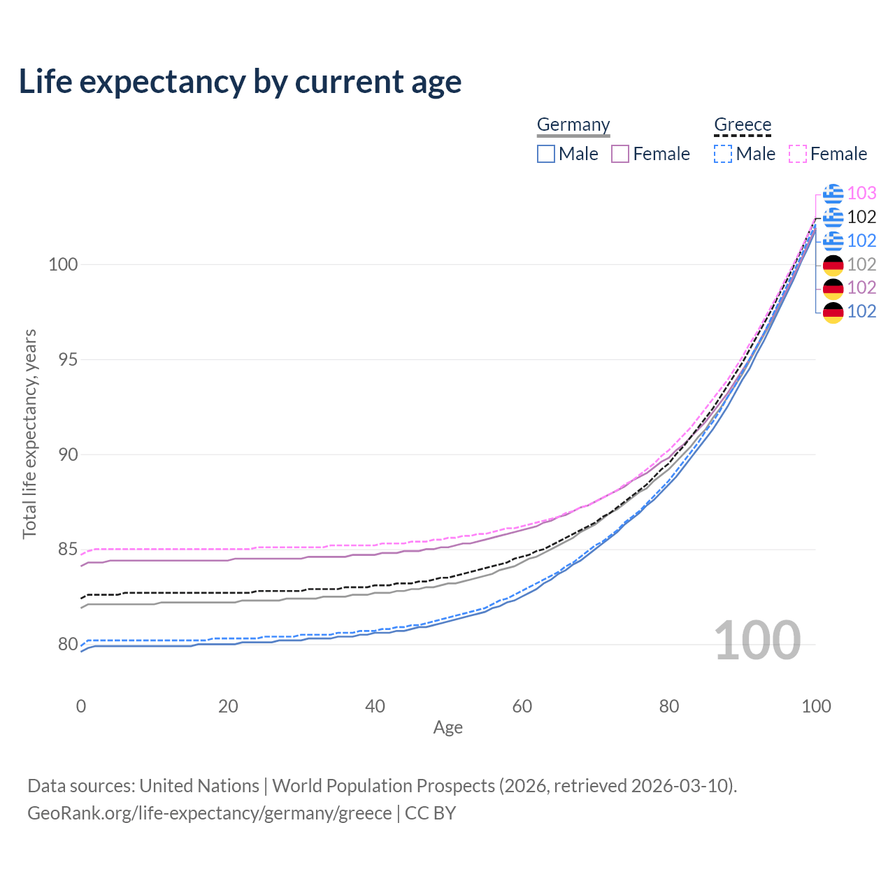 This life expectancy calculator shows the odds of living to 100, 95, 90, and below based on current age for both males and females in Germany and Greece, along with mean and median age of death. The calculations are based on the 2026 life tables (actuarial tables) from the UN World Population Prospects.