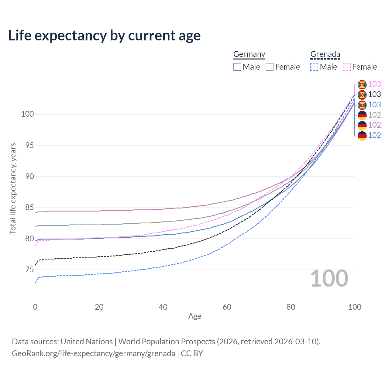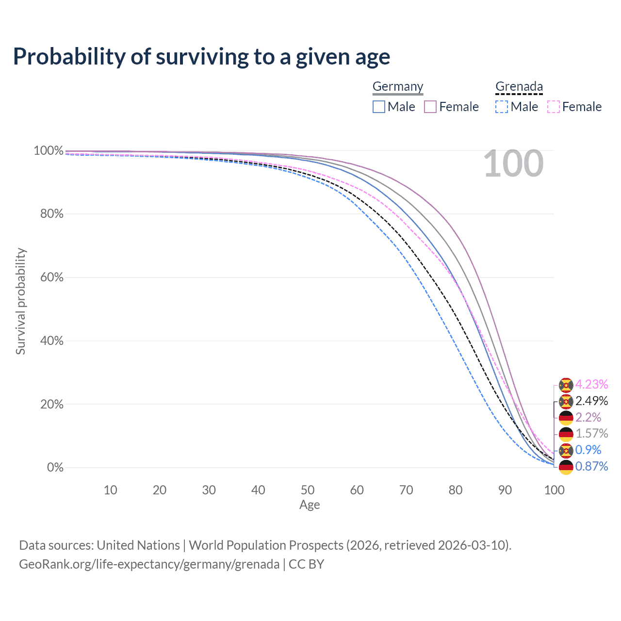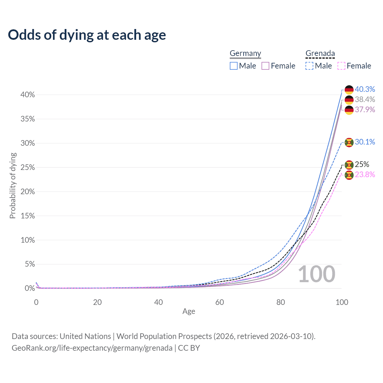 This life expectancy calculator shows the odds of living to 100, 95, 90, and below based on current age for both males and females in Germany and Grenada, along with mean and median age of death. The calculations are based on the 2026 life tables (actuarial tables) from the UN World Population Prospects.