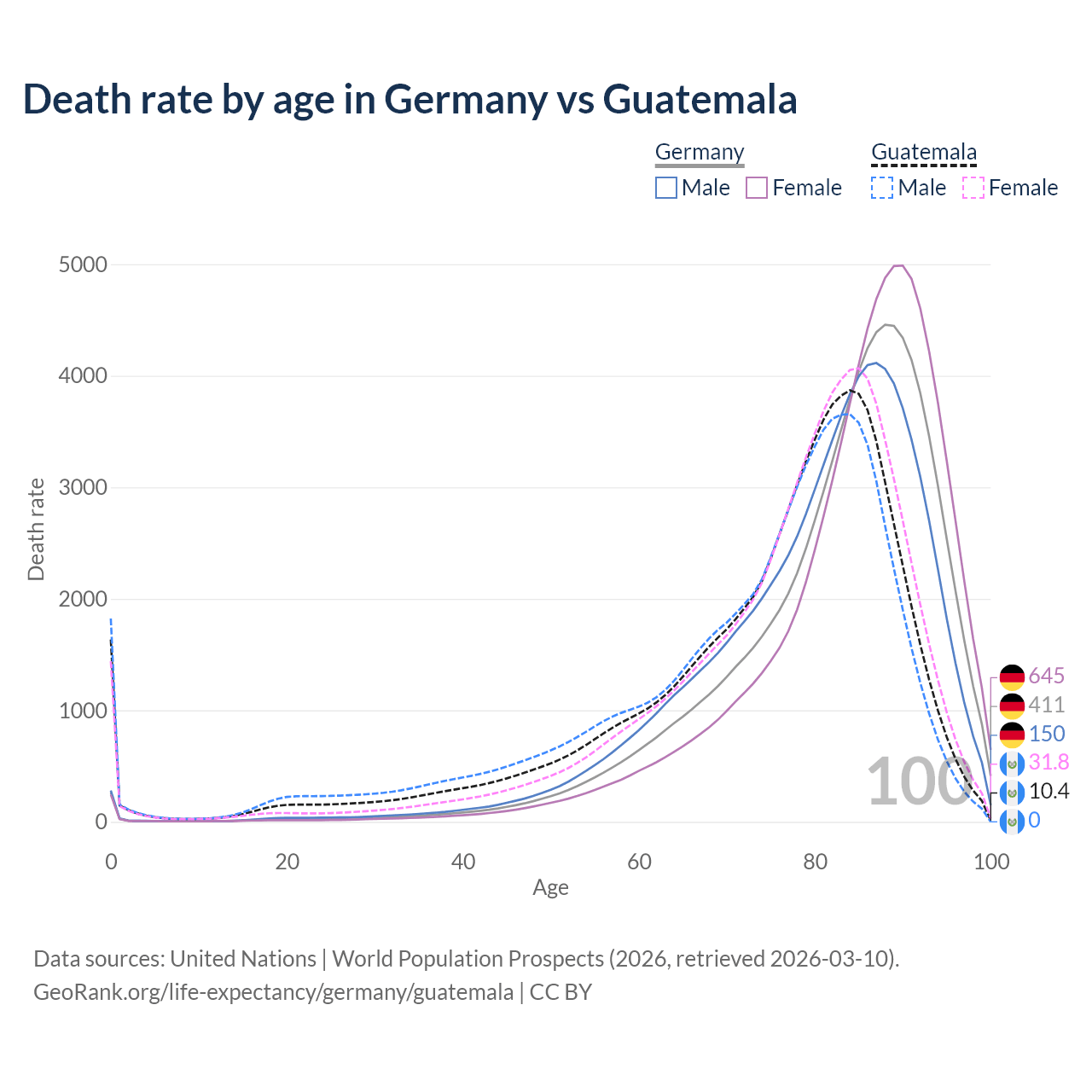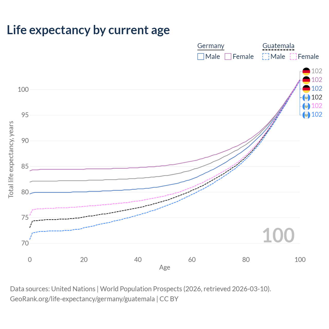 This life expectancy calculator shows the odds of living to 100, 95, 90, and below based on current age for both males and females in Germany and Guatemala, along with mean and median age of death. The calculations are based on the 2026 life tables (actuarial tables) from the UN World Population Prospects.