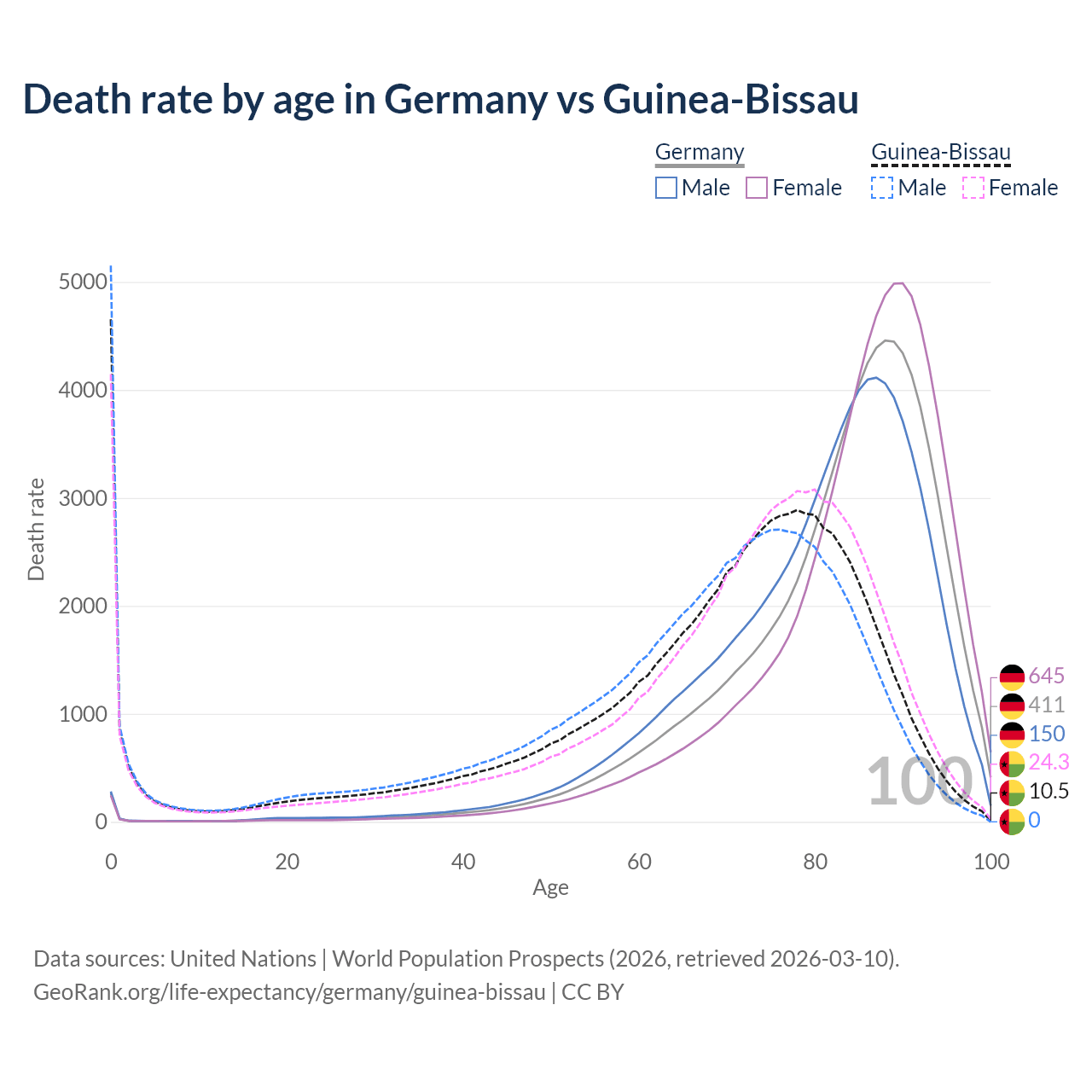 This life expectancy calculator shows the odds of living to 100, 95, 90, and below based on current age for both males and females in Germany and Guinea-Bissau, along with mean and median age of death. The calculations are based on the 2026 life tables (actuarial tables) from the UN World Population Prospects.