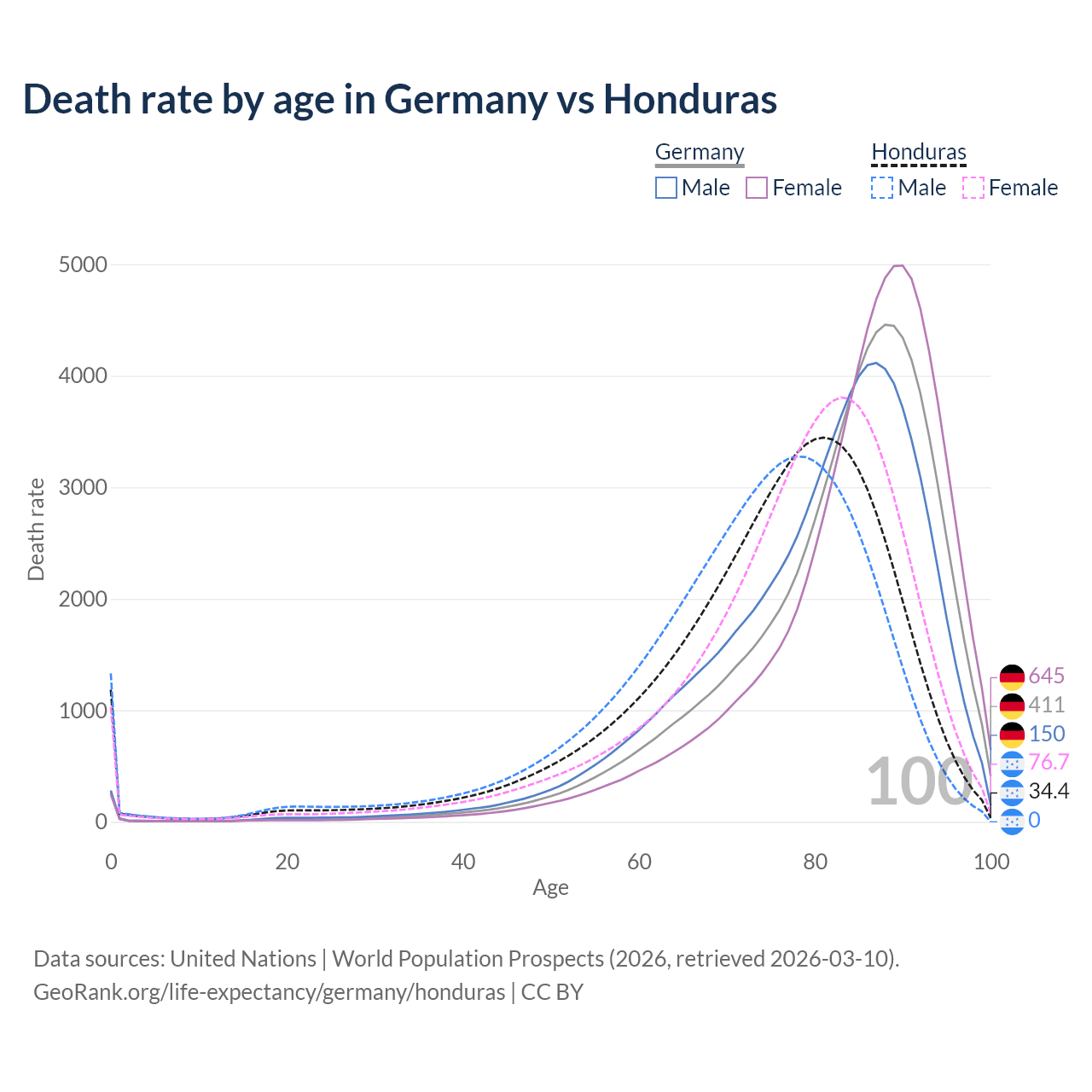 In Germany, the most common age of death is 88, compared to 81 in Honduras. The median age of death is 85.1 in Germany and 77.1 in Honduras, meaning only half of each cohort is expected to live past that age.