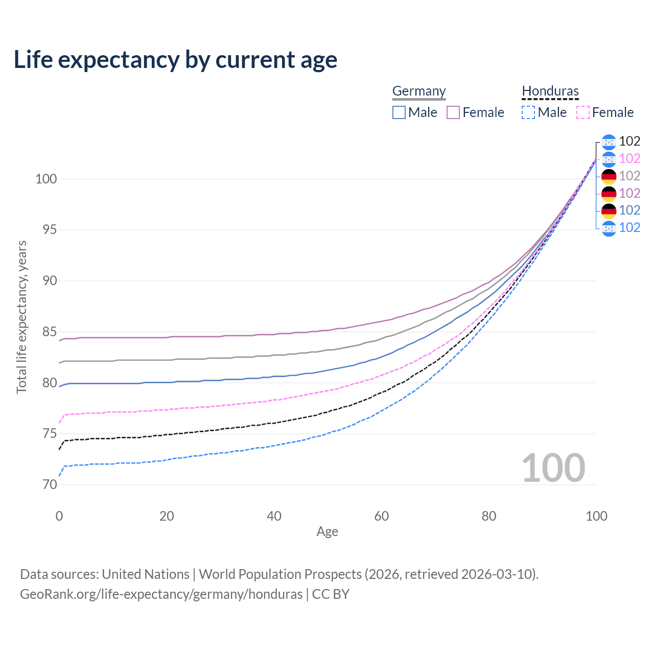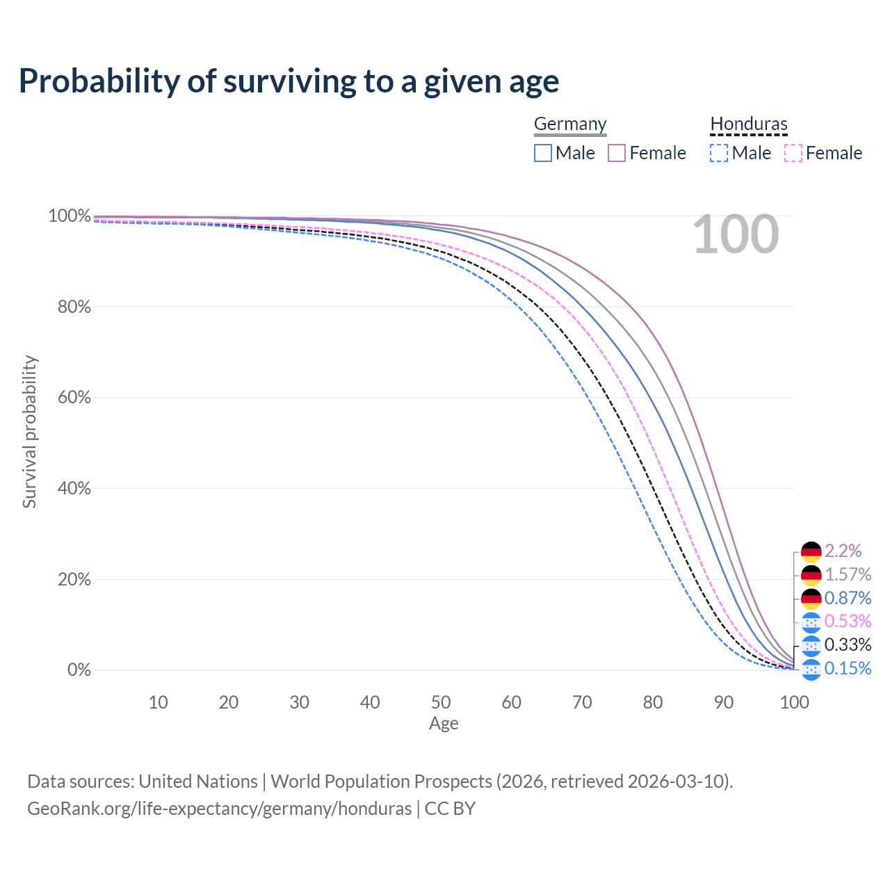 This life expectancy calculator shows the odds of living to 100, 95, 90, and below based on current age for both males and females in Germany and Honduras, along with mean and median age of death. The calculations are based on the 2026 life tables (actuarial tables) from the UN World Population Prospects.