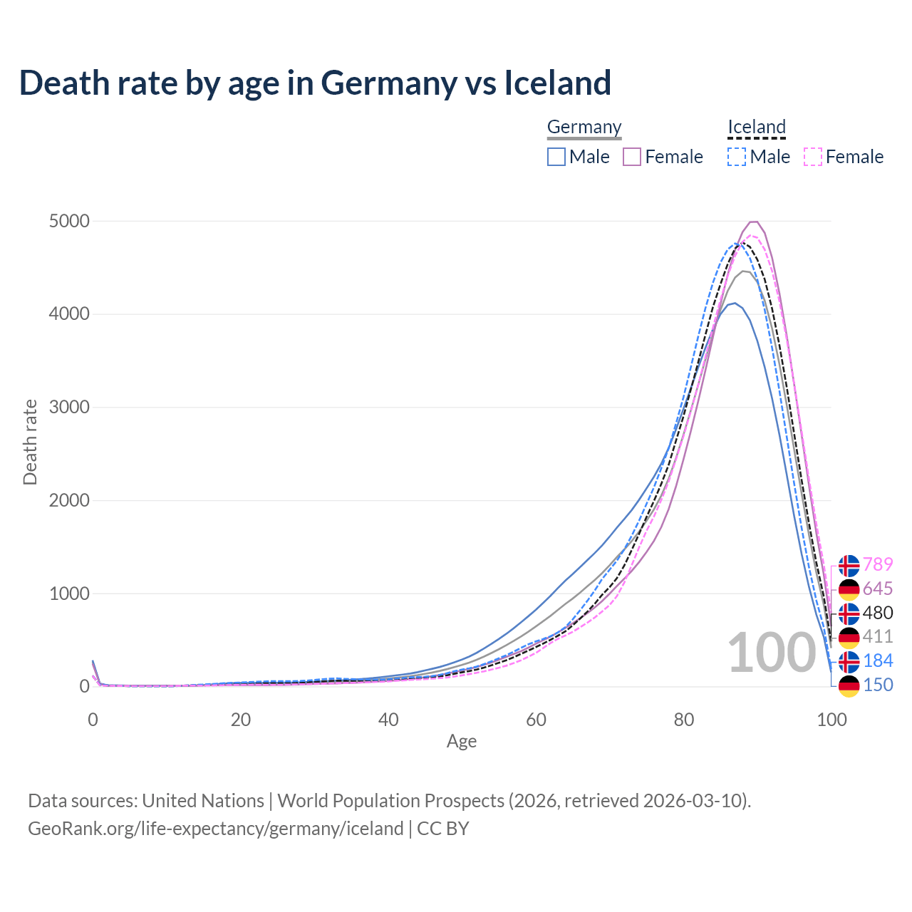 This life expectancy calculator shows the odds of living to 100, 95, 90, and below based on current age for both males and females in Germany and Iceland, along with mean and median age of death. The calculations are based on the 2026 life tables (actuarial tables) from the UN World Population Prospects.