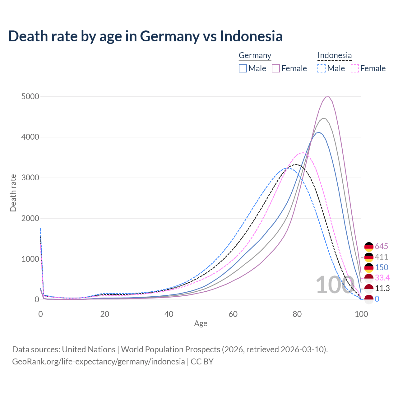 In Germany, the most common age of death is 88, compared to 80 in Indonesia. The median age of death is 85.1 in Germany and 75.6 in Indonesia, meaning only half of each cohort is expected to live past that age.
