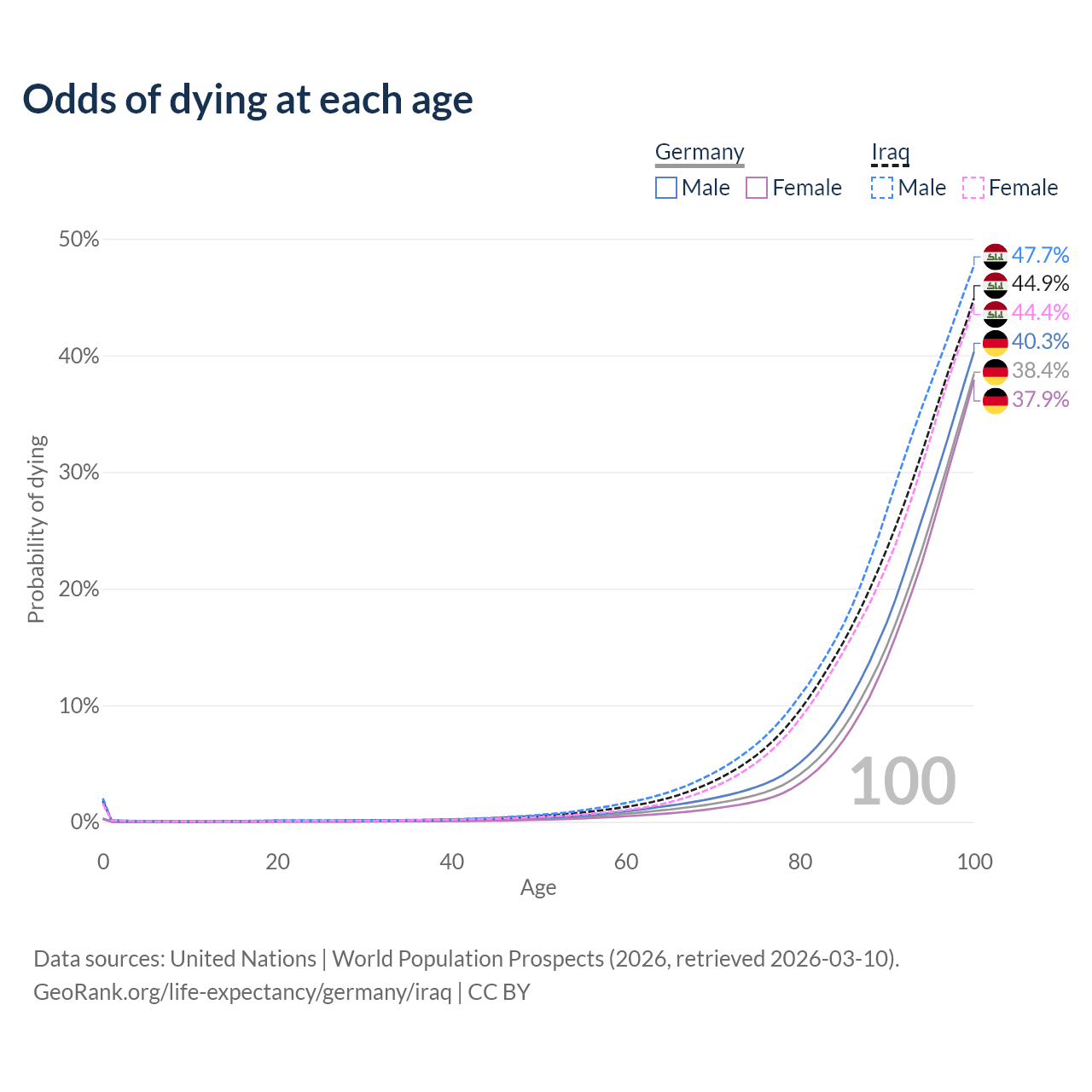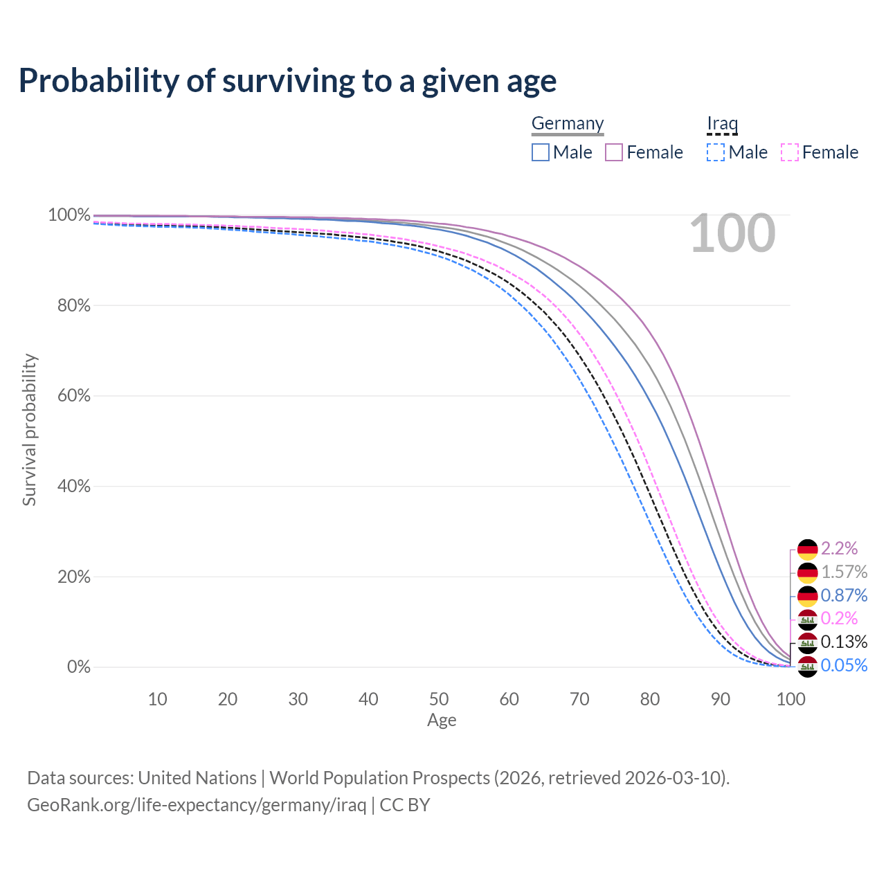 This life expectancy calculator shows the odds of living to 100, 95, 90, and below based on current age for both males and females in Germany and Iraq, along with mean and median age of death. The calculations are based on the 2026 life tables (actuarial tables) from the UN World Population Prospects.