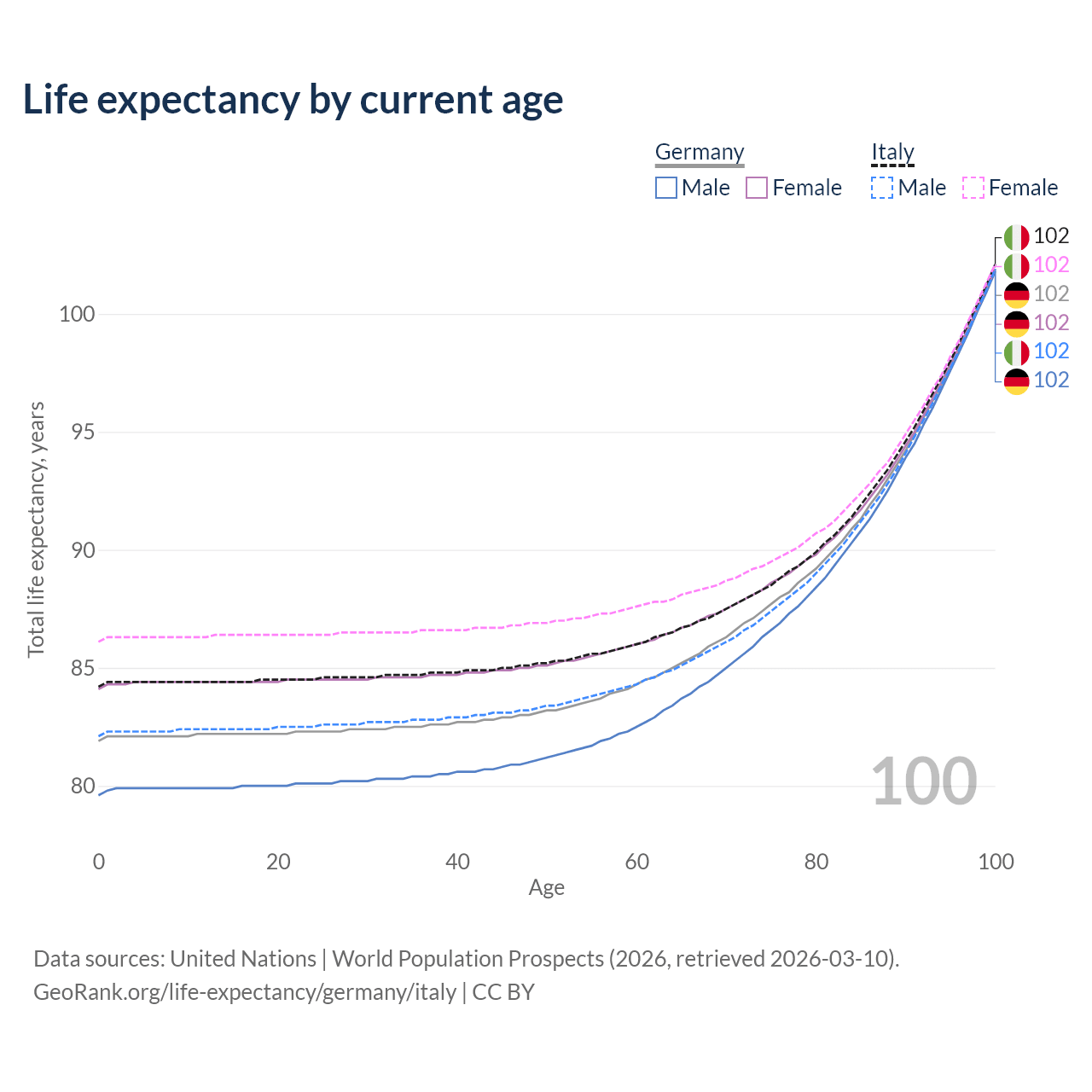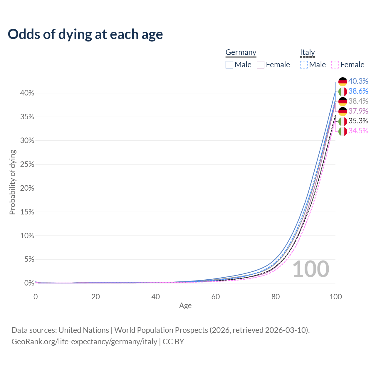 This life expectancy calculator shows the odds of living to 100, 95, 90, and below based on current age for both males and females in Germany and Italy, along with mean and median age of death. The calculations are based on the 2026 life tables (actuarial tables) from the UN World Population Prospects.