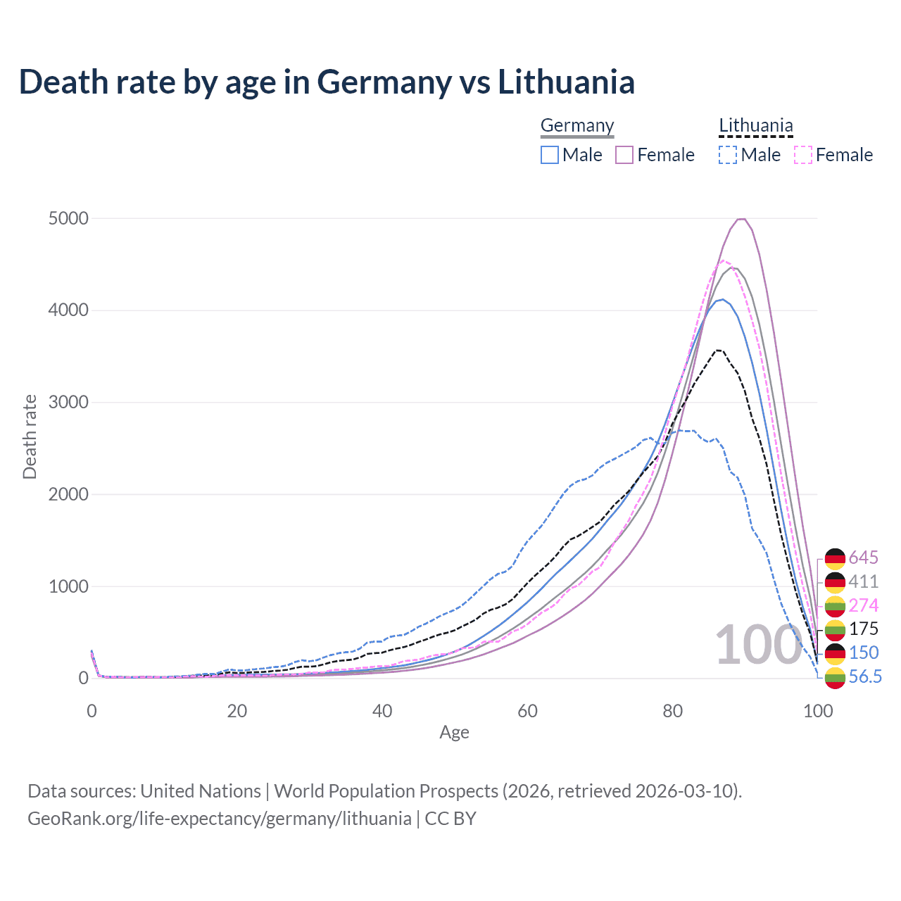 In Germany, the most common age of death is 88, compared to 86 in Lithuania. The median age of death is 85.1 in Germany and 80.4 in Lithuania, meaning only half of each cohort is expected to live past that age.