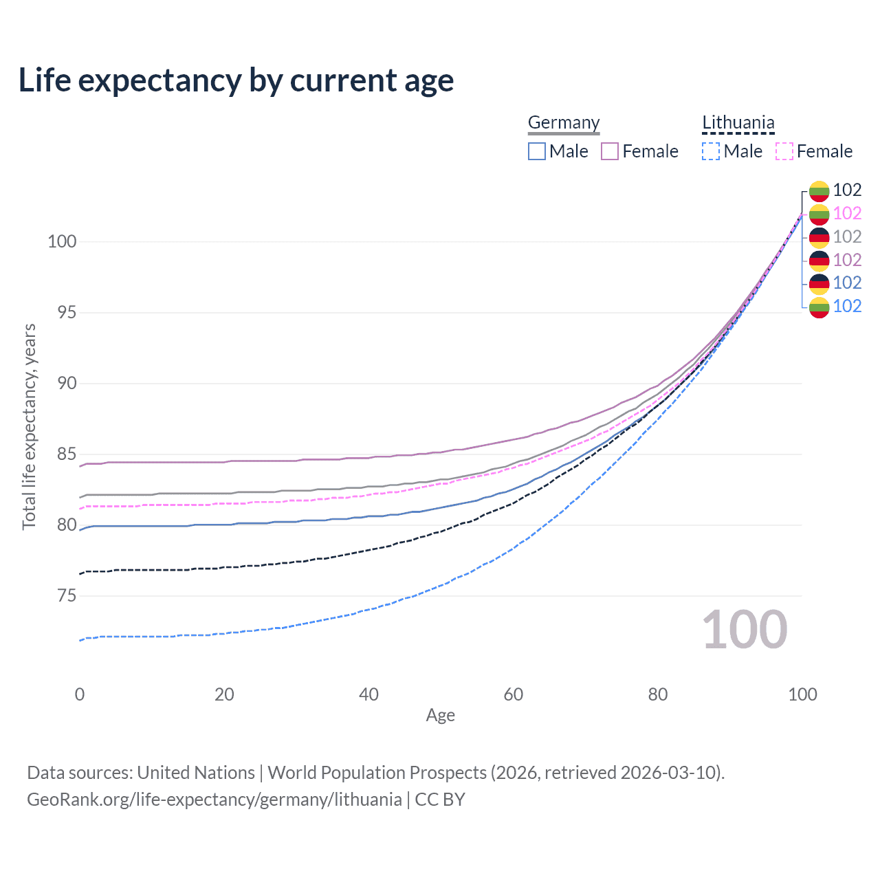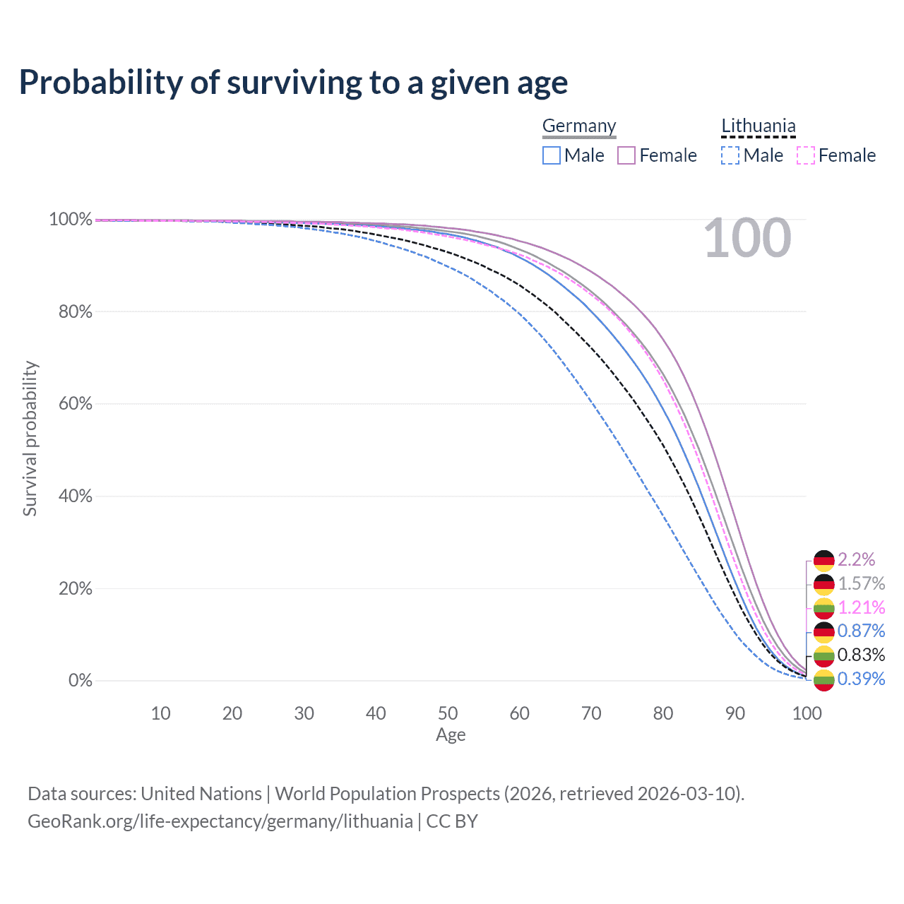 This life expectancy calculator shows the odds of living to 100, 95, 90, and below based on current age for both males and females in Germany and Lithuania, along with mean and median age of death. The calculations are based on the 2026 life tables (actuarial tables) from the UN World Population Prospects.