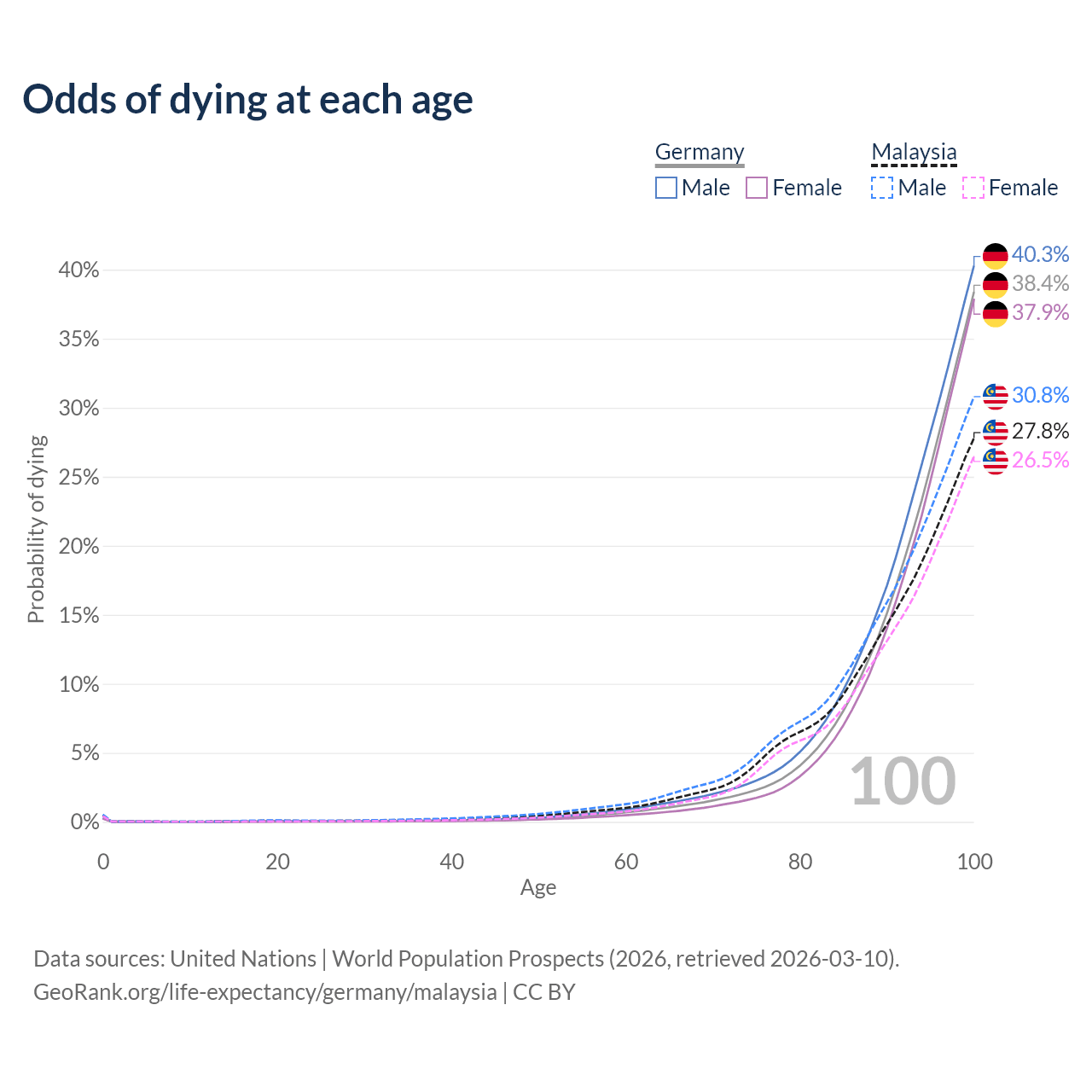 This life expectancy calculator shows the odds of living to 100, 95, 90, and below based on current age for both males and females in Germany and Malaysia, along with mean and median age of death. The calculations are based on the 2026 life tables (actuarial tables) from the UN World Population Prospects.