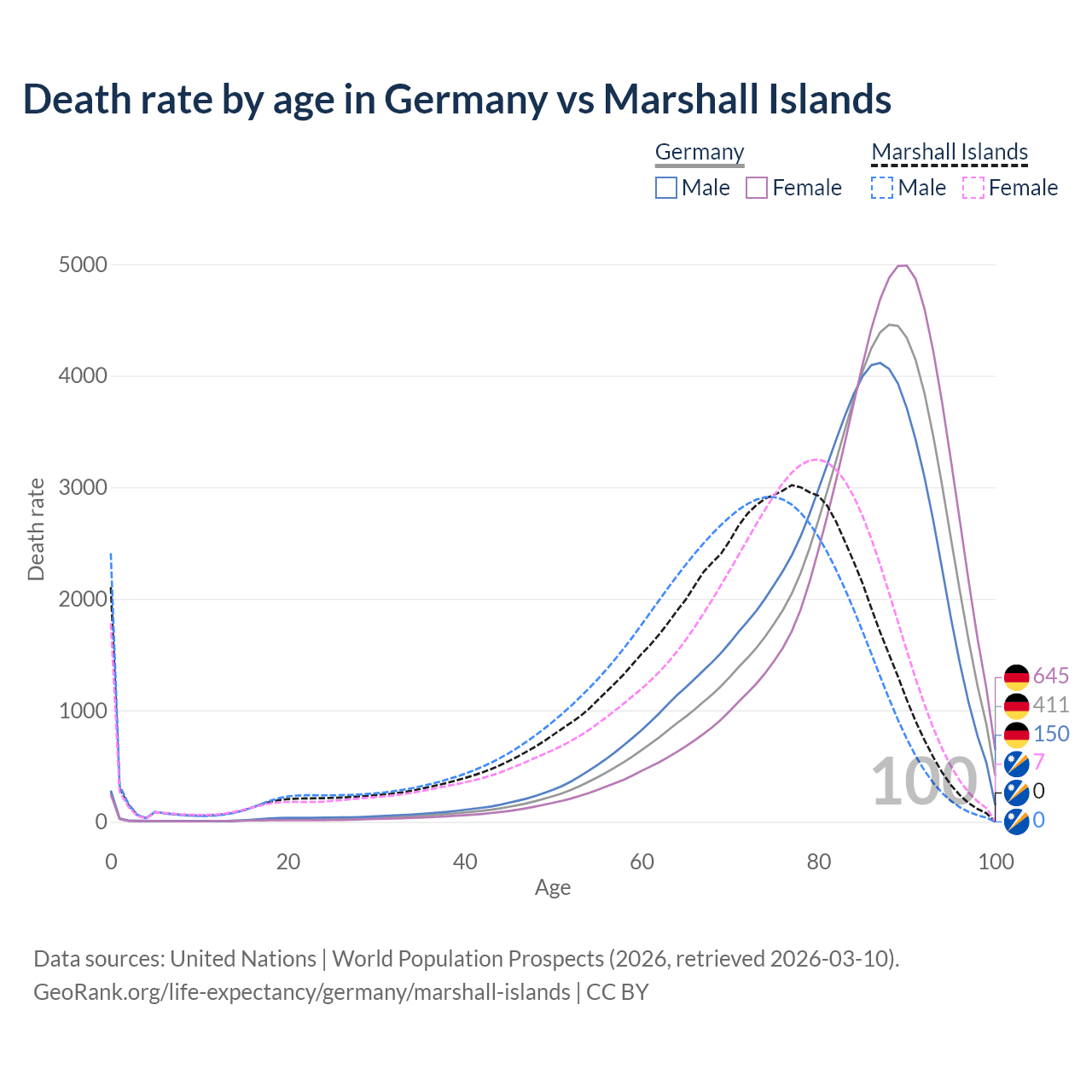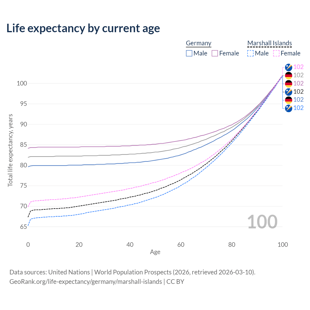 This life expectancy calculator shows the odds of living to 100, 95, 90, and below based on current age for both males and females in Germany and the Marshall Islands, along with mean and median age of death. The calculations are based on the 2026 life tables (actuarial tables) from the UN World Population Prospects.