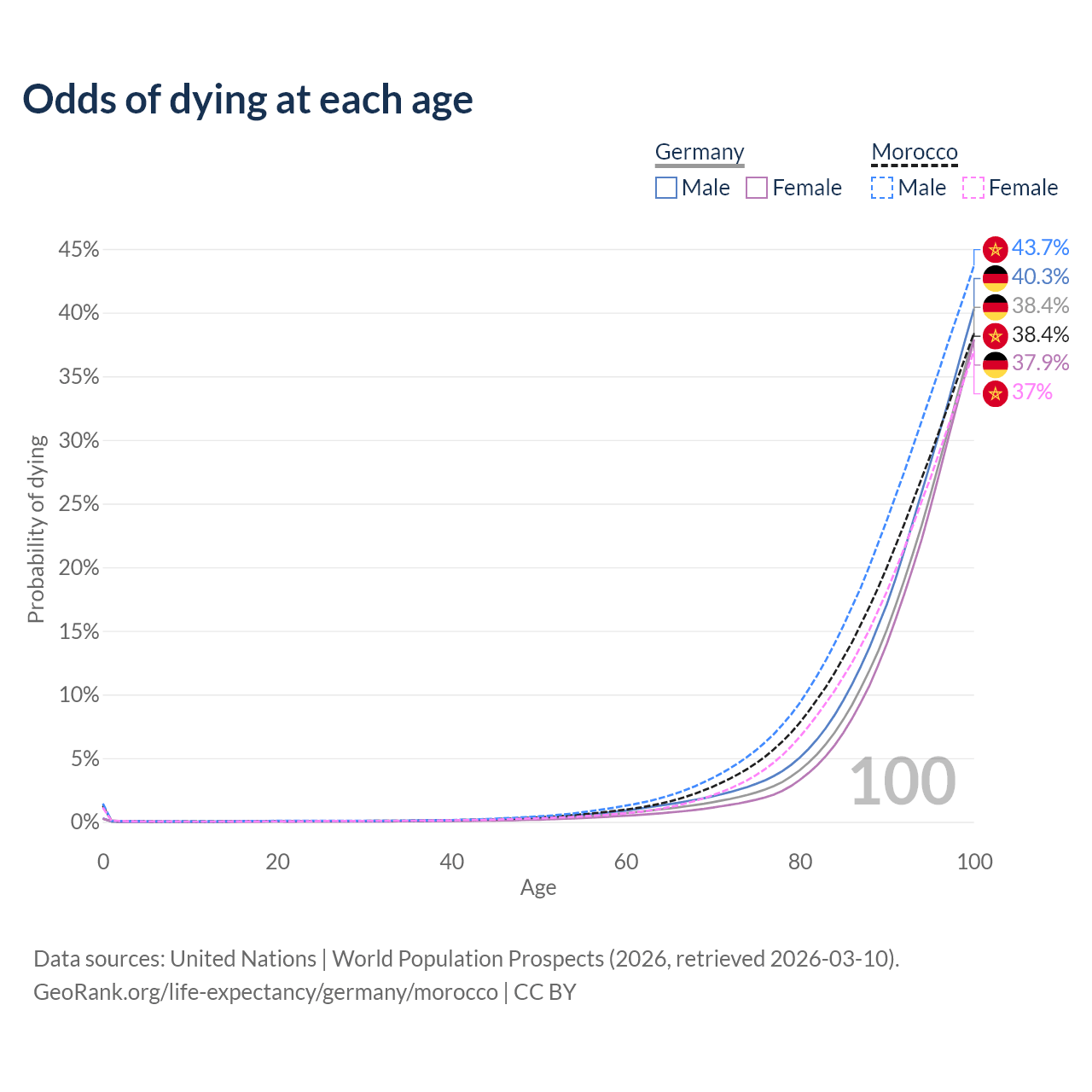 This life expectancy calculator shows the odds of living to 100, 95, 90, and below based on current age for both males and females in Germany and Morocco, along with mean and median age of death. The calculations are based on the 2026 life tables (actuarial tables) from the UN World Population Prospects.