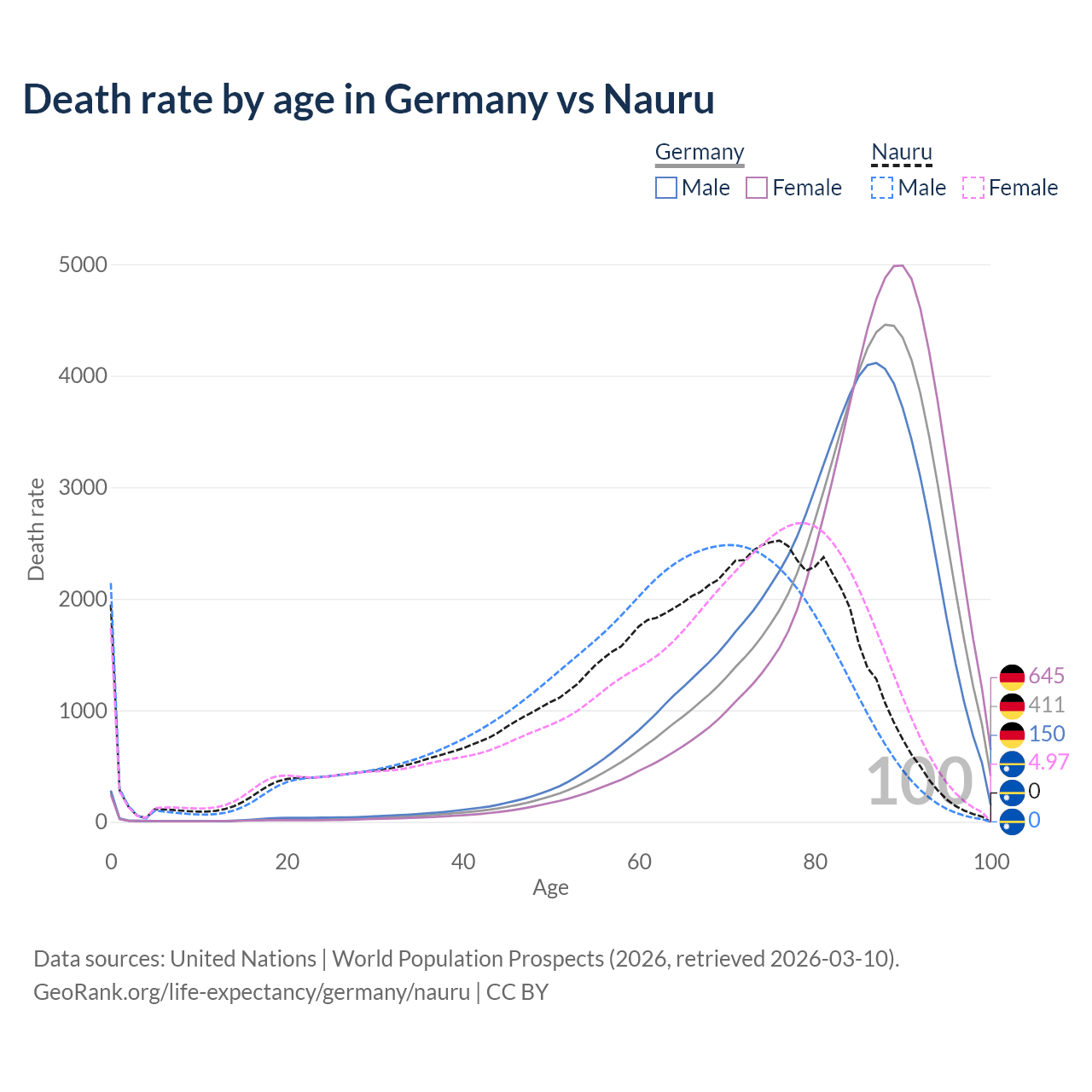 In Germany, the most common age of death is 88, compared to 76 in Nauru. The median age of death is 85.1 in Germany and 67.3 in Nauru, meaning only half of each cohort is expected to live past that age.