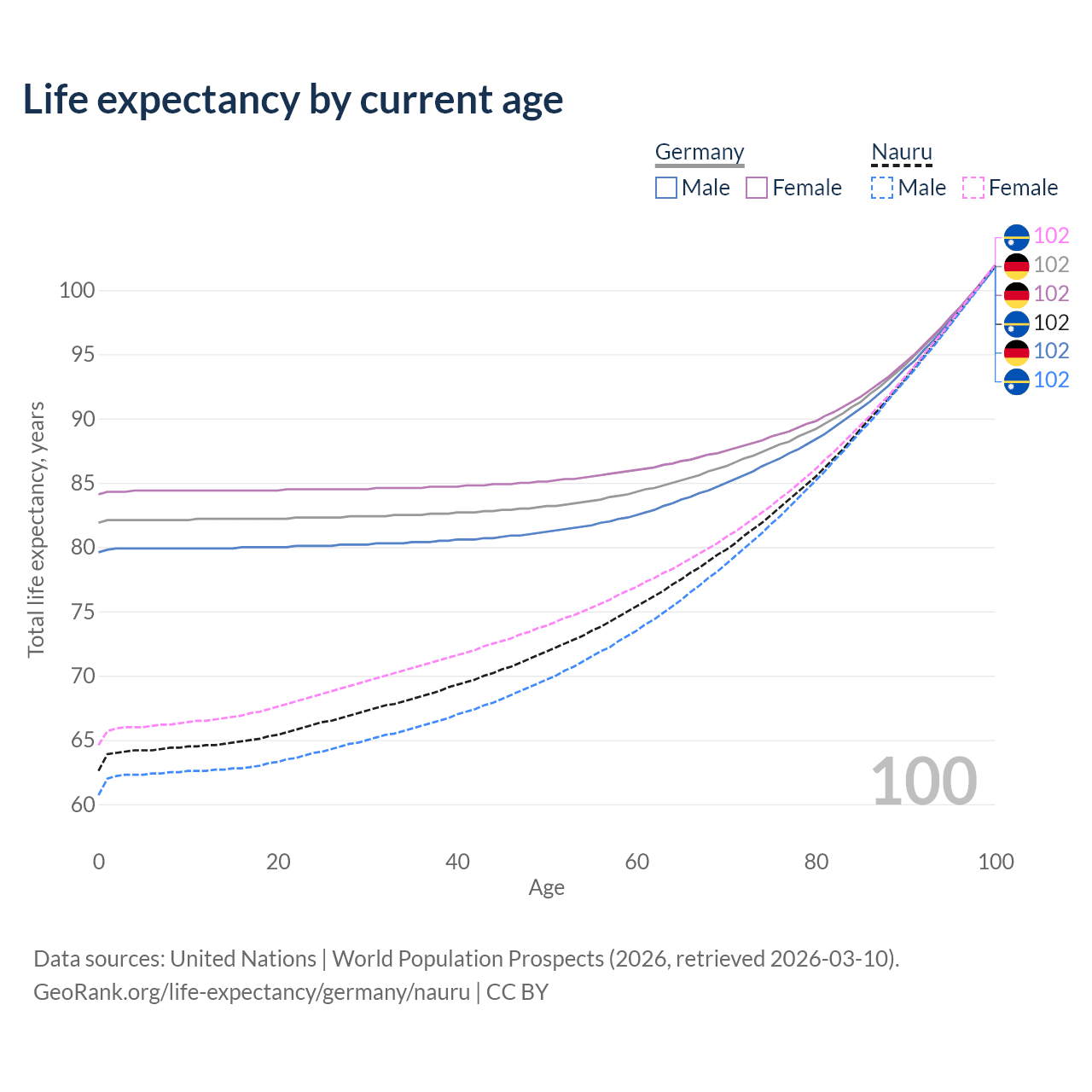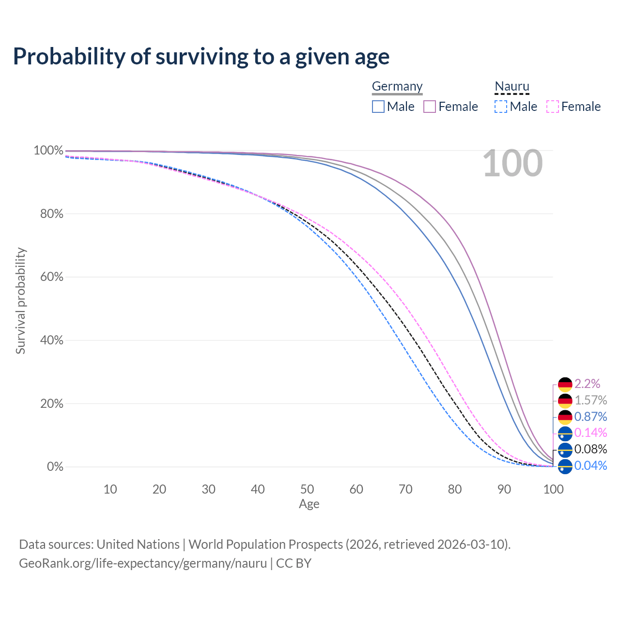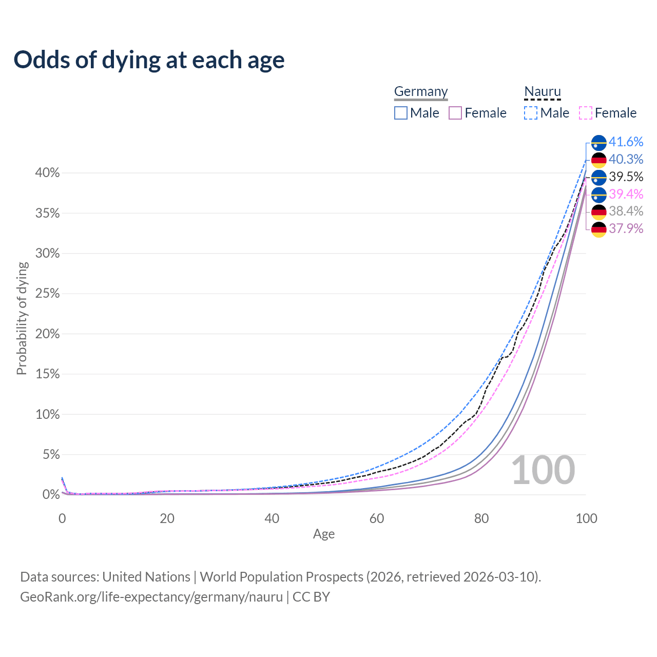 This life expectancy calculator shows the odds of living to 100, 95, 90, and below based on current age for both males and females in Germany and Nauru, along with mean and median age of death. The calculations are based on the 2026 life tables (actuarial tables) from the UN World Population Prospects.