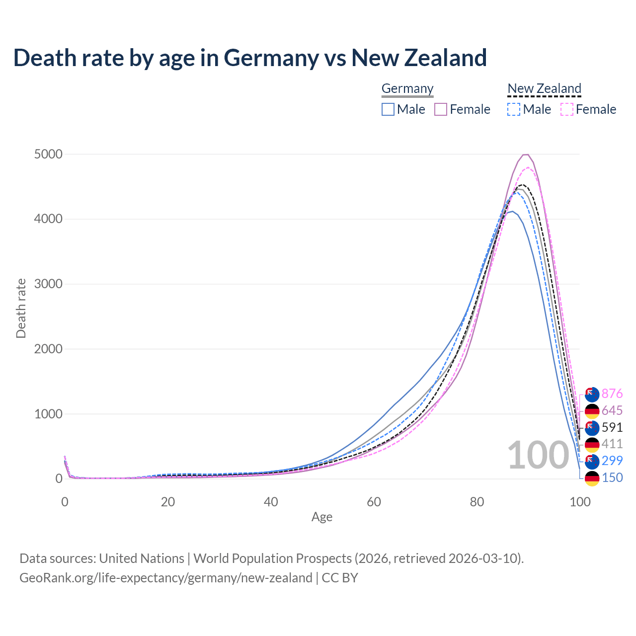 In Germany, the most common age of death is 88, compared to 89 in New Zealand. The median age of death is 85.1 in Germany and 85.8 in New Zealand, meaning only half of each cohort is expected to live past that age.