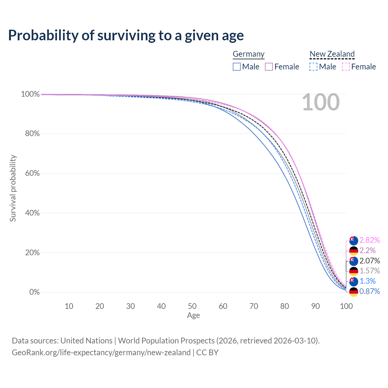 This life expectancy calculator shows the odds of living to 100, 95, 90, and below based on current age for both males and females in Germany and New Zealand, along with mean and median age of death. The calculations are based on the 2026 life tables (actuarial tables) from the UN World Population Prospects.