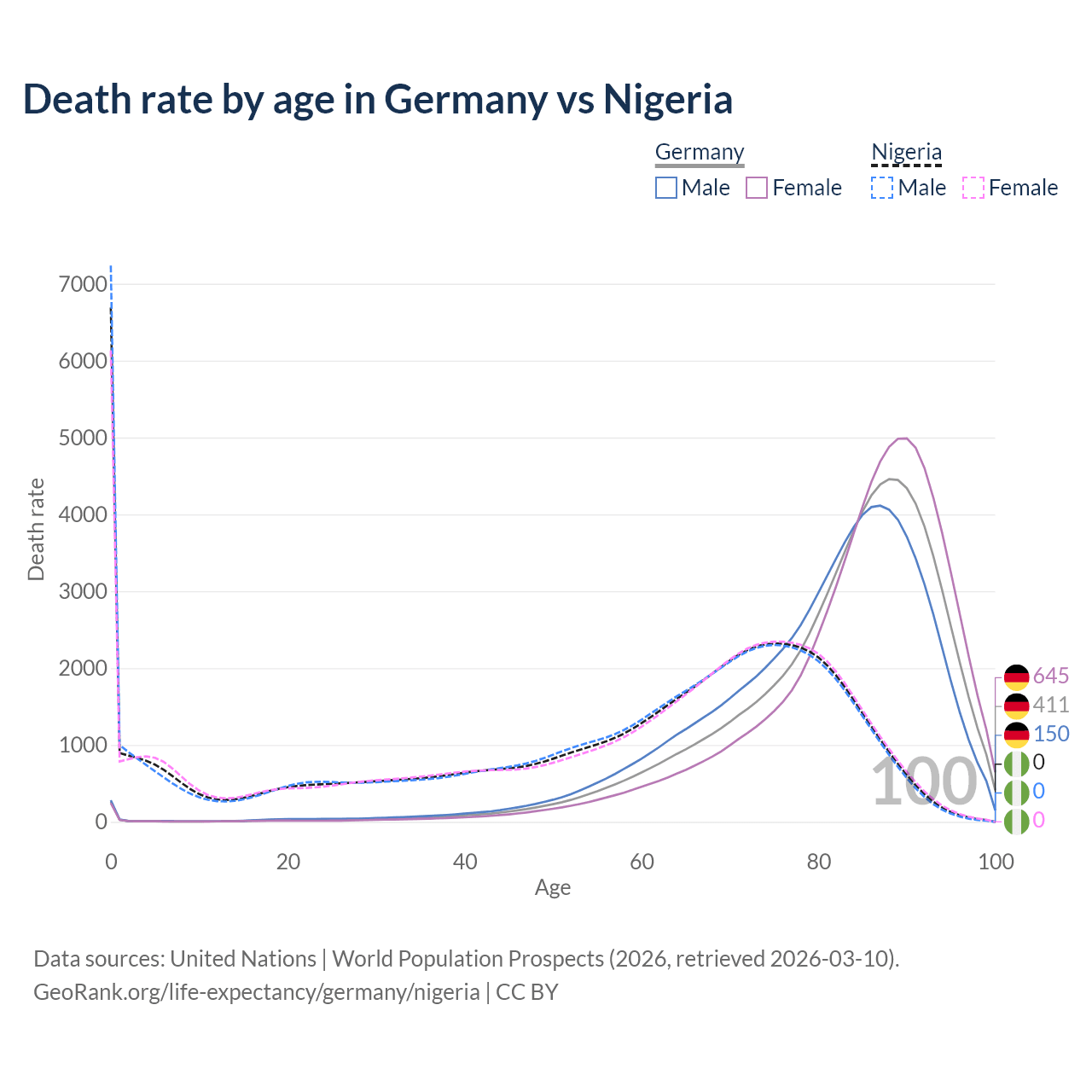 In Germany, the most common age of death is 88, compared to 0 in Nigeria. The median age of death is 85.1 in Germany and 64.3 in Nigeria, meaning only half of each cohort is expected to live past that age.
