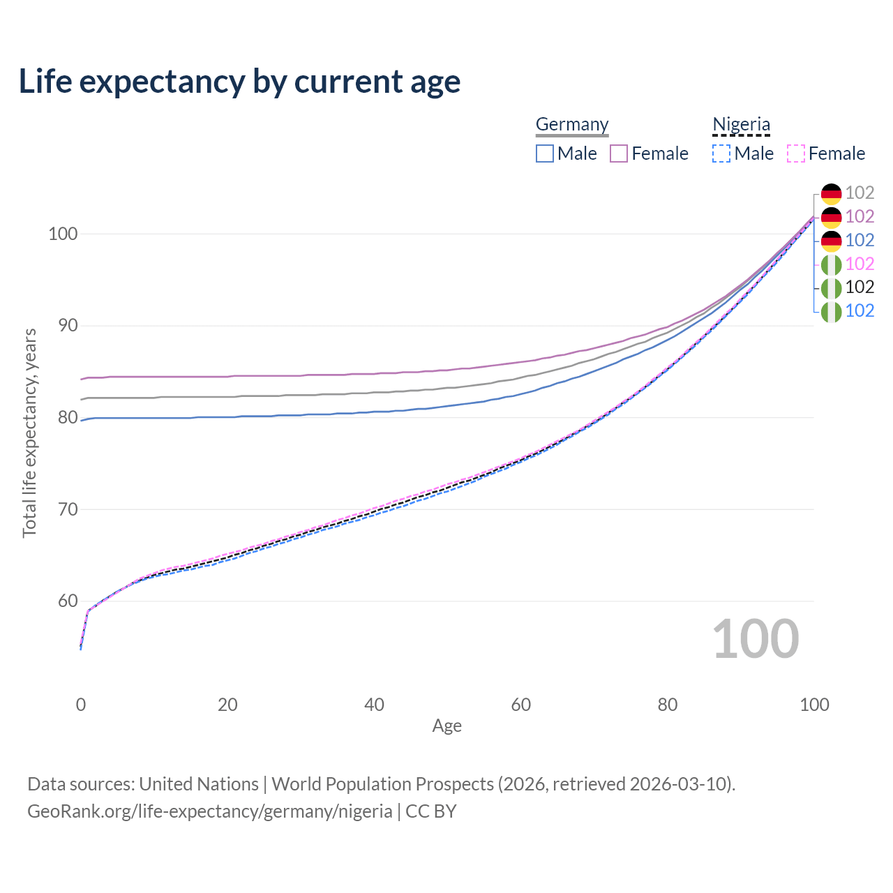 This life expectancy calculator shows the odds of living to 100, 95, 90, and below based on current age for both males and females in Germany and Nigeria, along with mean and median age of death. The calculations are based on the 2026 life tables (actuarial tables) from the UN World Population Prospects.