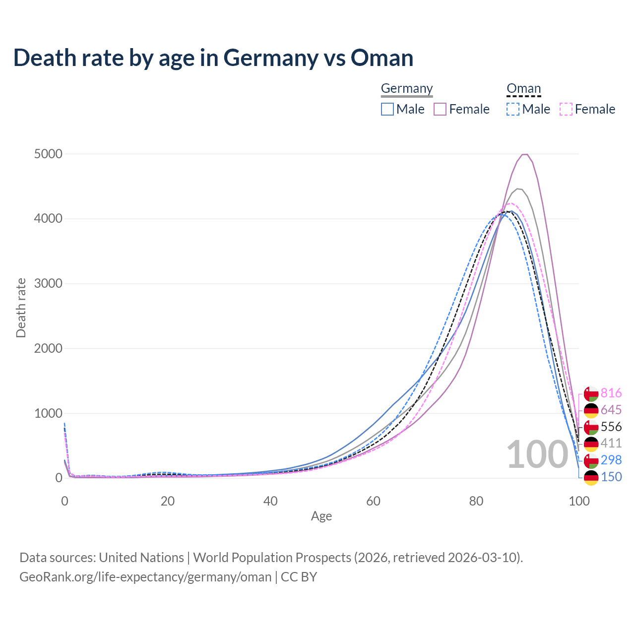 In Germany, the most common age of death is 88, compared to 86 in Oman. The median age of death is 85.1 in Germany and 83.5 in Oman, meaning only half of each cohort is expected to live past that age.
