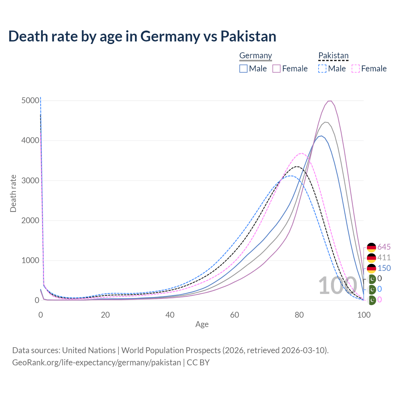 In Germany, the most common age of death is 88, compared to 0 in Pakistan. The median age of death is 85.1 in Germany and 74.3 in Pakistan, meaning only half of each cohort is expected to live past that age.