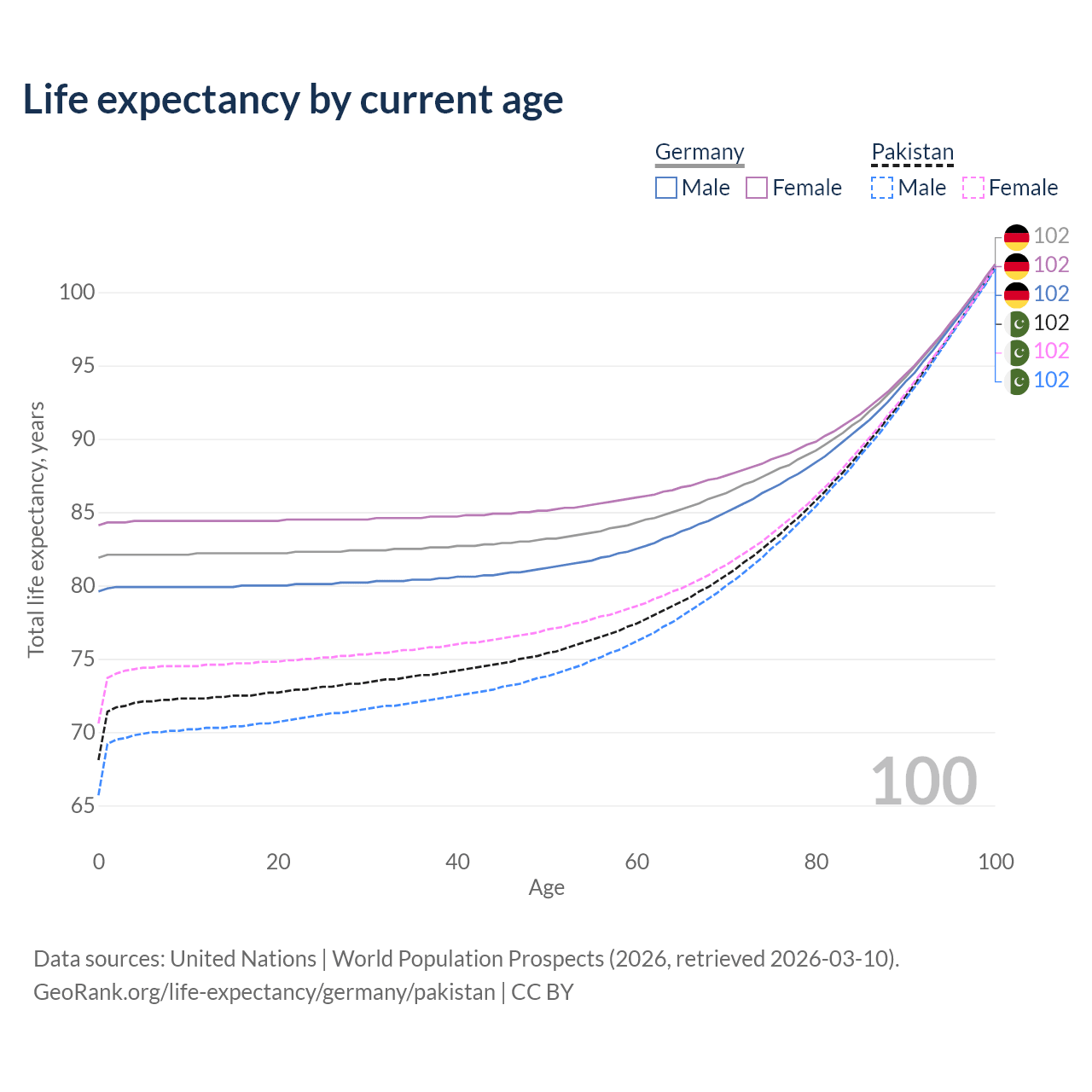 This life expectancy calculator shows the odds of living to 100, 95, 90, and below based on current age for both males and females in Germany and Pakistan, along with mean and median age of death. The calculations are based on the 2026 life tables (actuarial tables) from the UN World Population Prospects.