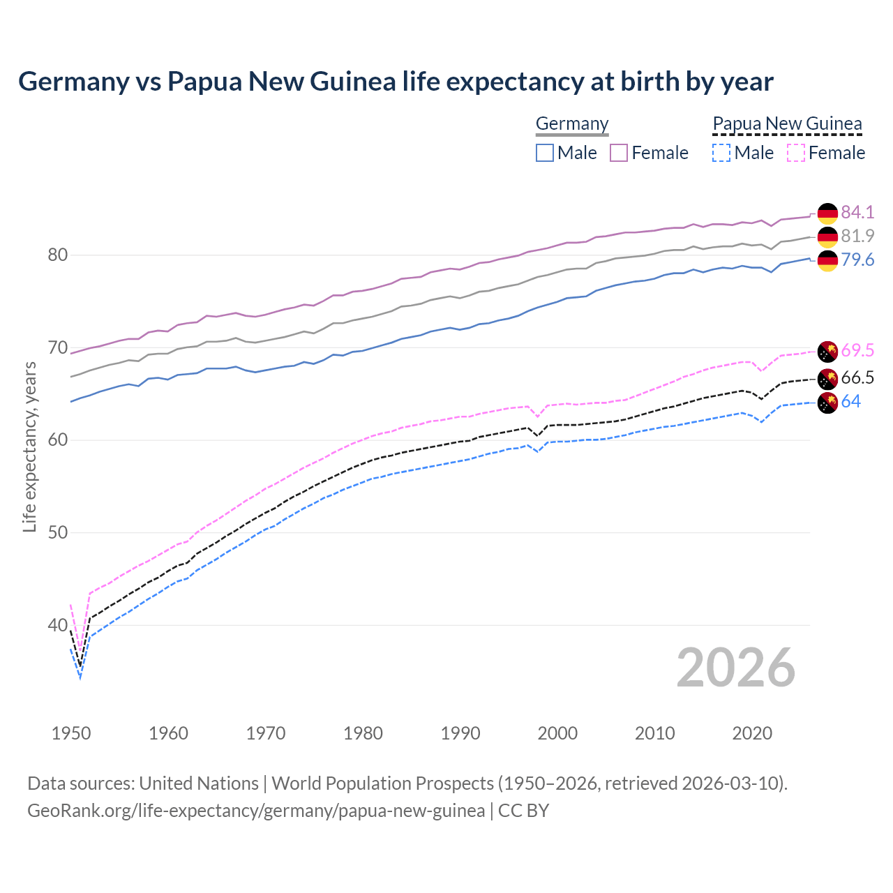 The average life expectancy at birth is 81.9 years in Germany vs 66.5 in Papua New Guinea. Germany is ranked 34/197 by life expectancy, and Papua New Guinea is 166/197. In Germany, the life expectancy is 79.6 years for males and 84.1 years for females. In Papua New Guinea, it's 64 years for males and 69.5 years for females.
