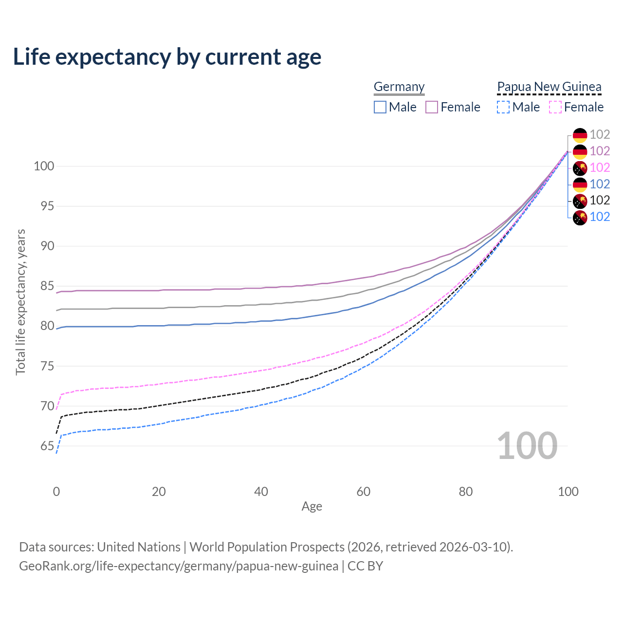 This life expectancy calculator shows the odds of living to 100, 95, 90, and below based on current age for both males and females in Germany and Papua New Guinea, along with mean and median age of death. The calculations are based on the 2026 life tables (actuarial tables) from the UN World Population Prospects.