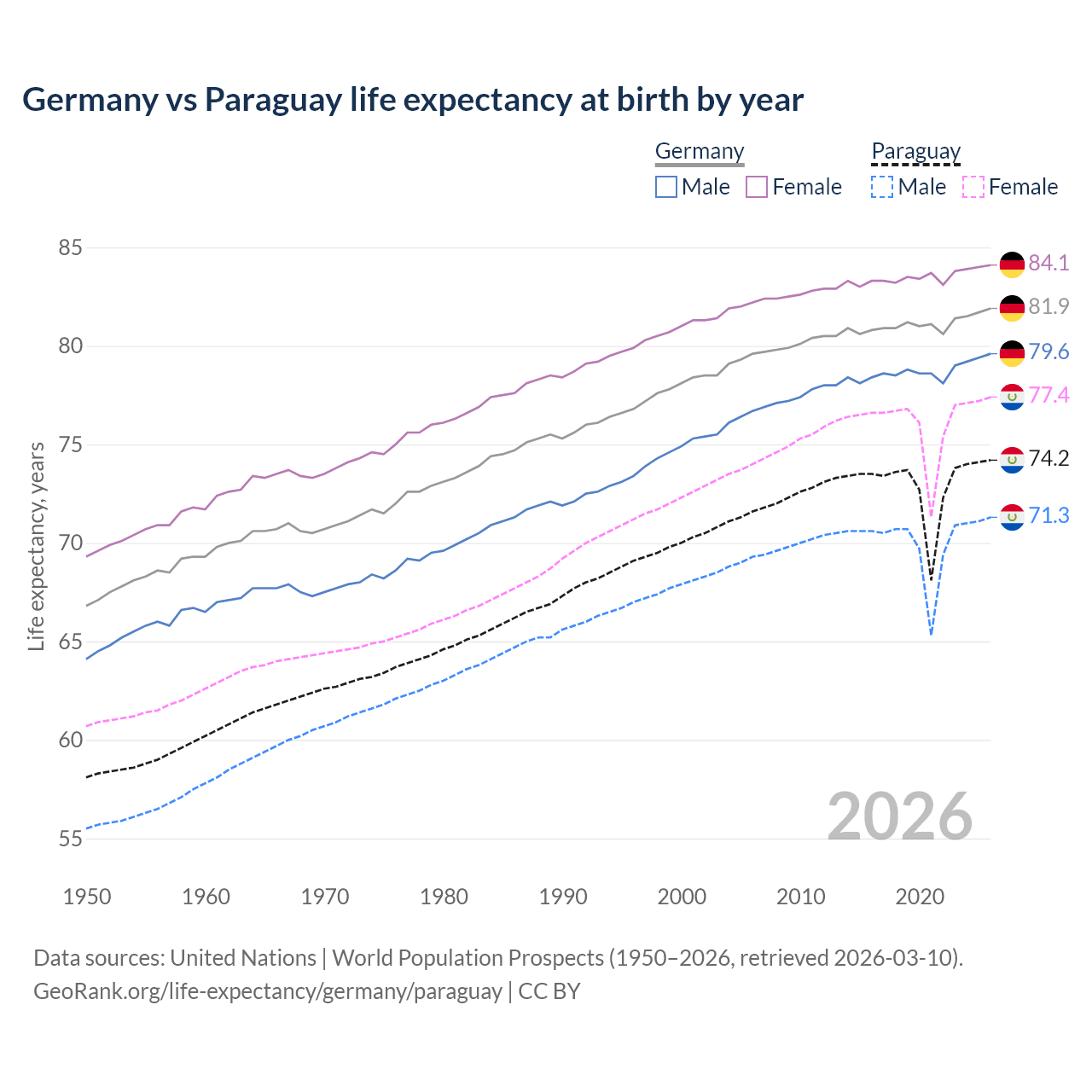 The average life expectancy at birth is 81.9 years in Germany vs 74.2 in Paraguay. Germany is ranked 34/197 by life expectancy, and Paraguay is 100/197. In Germany, the life expectancy is 79.6 years for males and 84.1 years for females. In Paraguay, it's 71.3 years for males and 77.4 years for females.