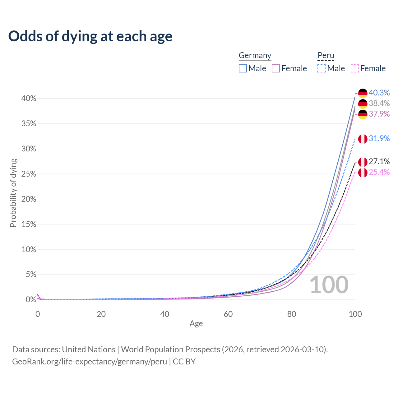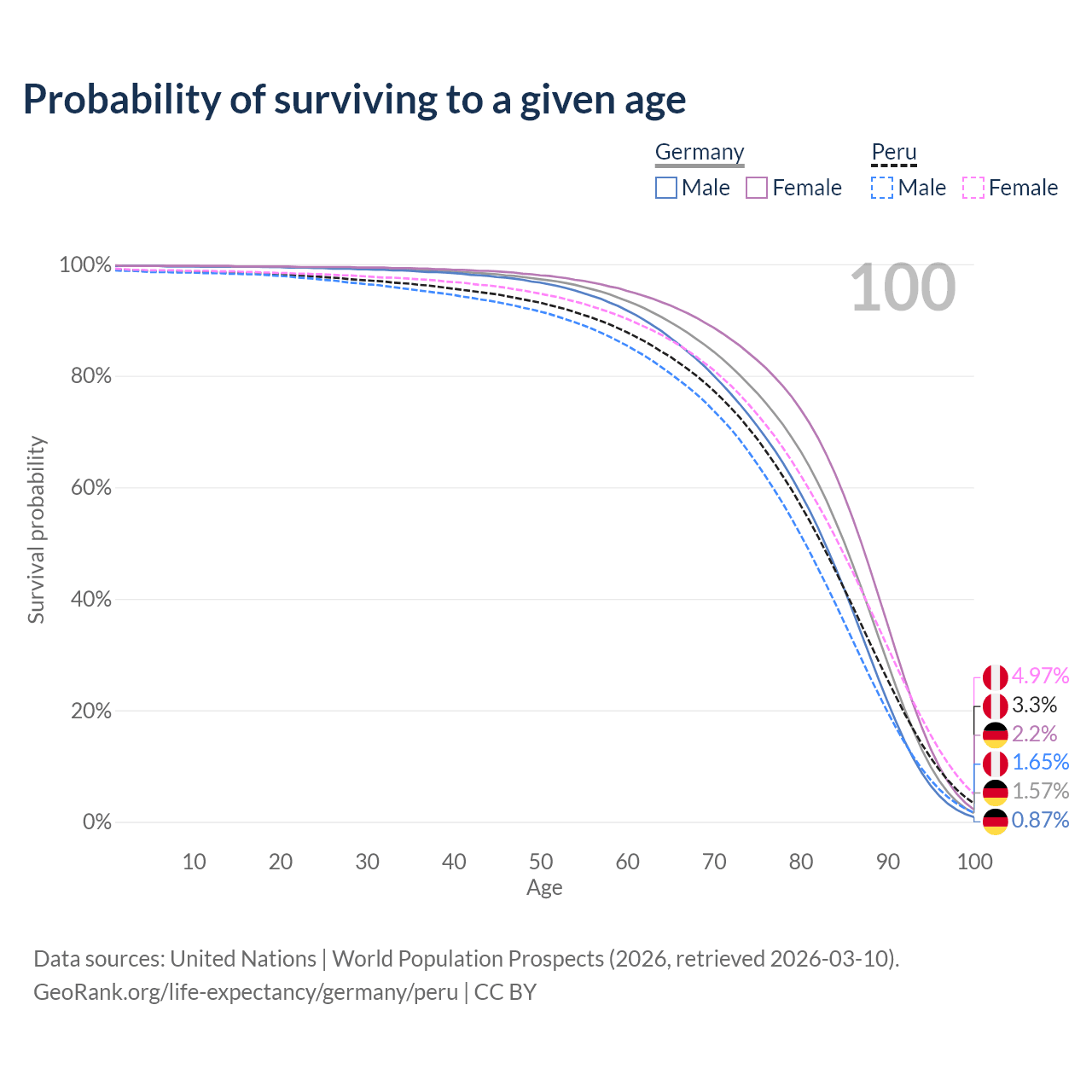 This life expectancy calculator shows the odds of living to 100, 95, 90, and below based on current age for both males and females in Germany and Peru, along with mean and median age of death. The calculations are based on the 2026 life tables (actuarial tables) from the UN World Population Prospects.
