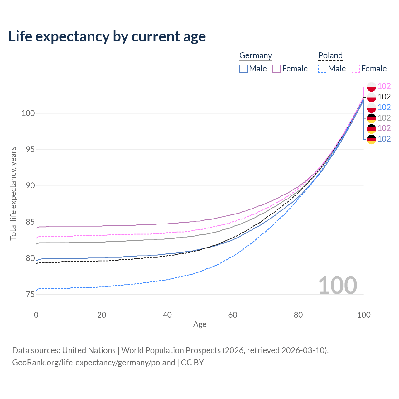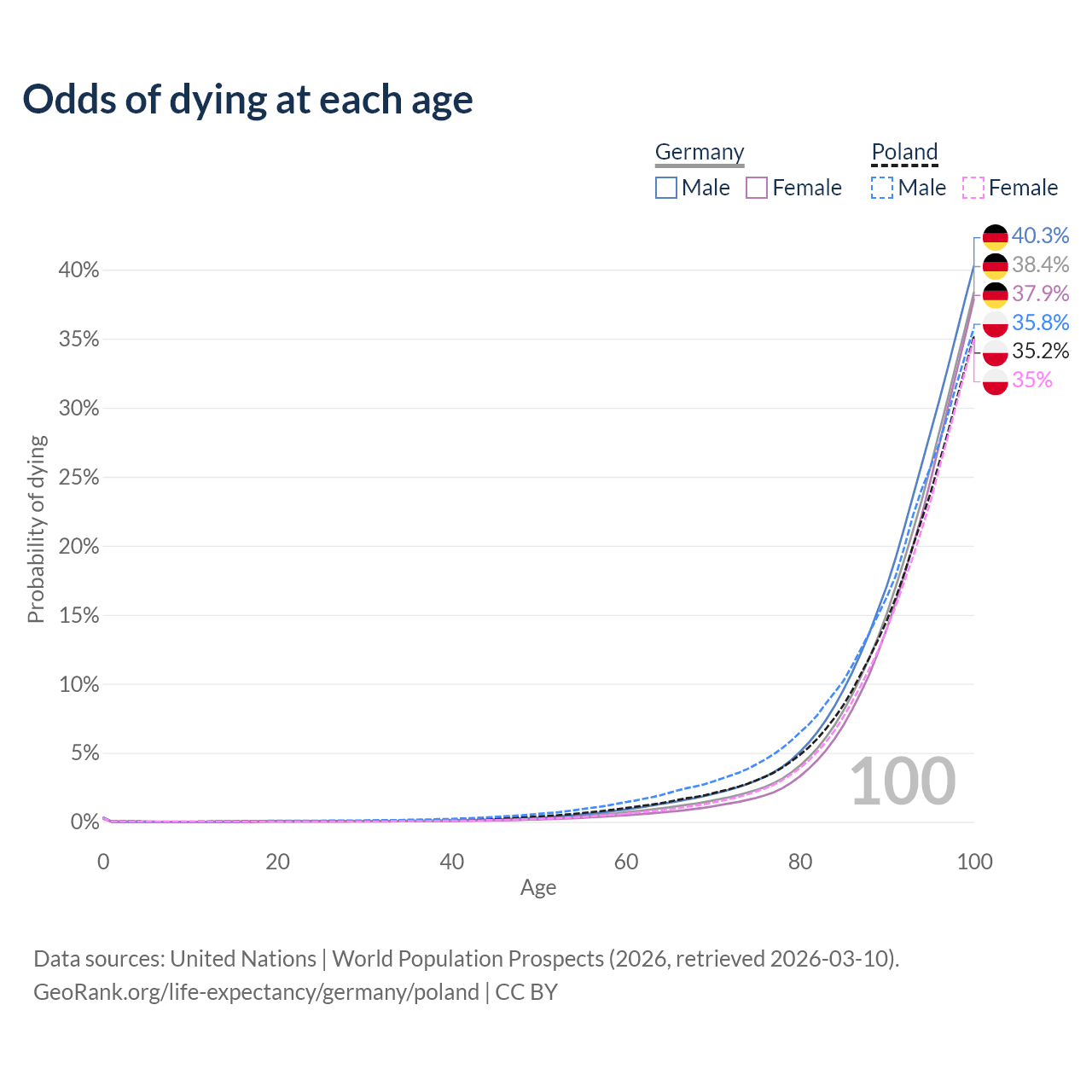 This life expectancy calculator shows the odds of living to 100, 95, 90, and below based on current age for both males and females in Germany and Poland, along with mean and median age of death. The calculations are based on the 2026 life tables (actuarial tables) from the UN World Population Prospects.