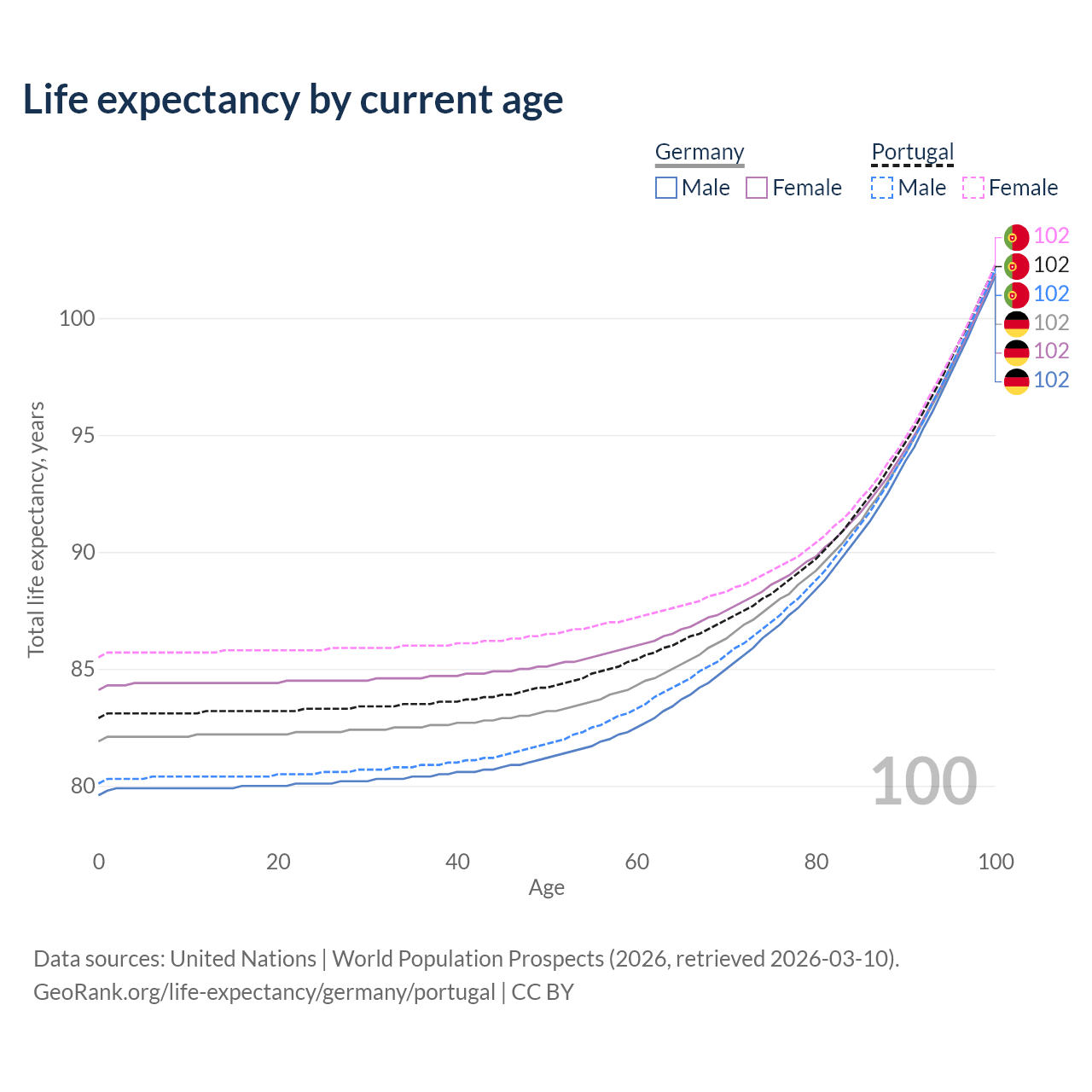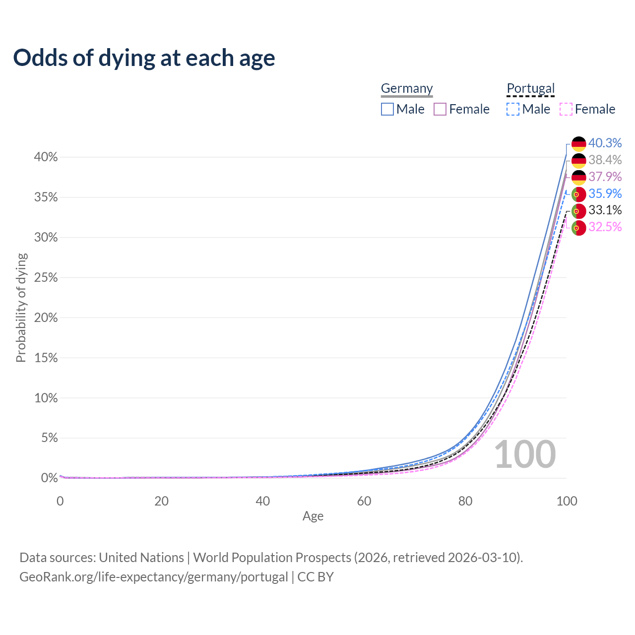 This life expectancy calculator shows the odds of living to 100, 95, 90, and below based on current age for both males and females in Germany and Portugal, along with mean and median age of death. The calculations are based on the 2026 life tables (actuarial tables) from the UN World Population Prospects.