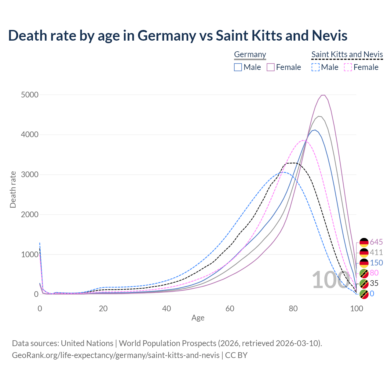In Germany, the most common age of death is 88, compared to 80 in Saint Kitts and Nevis. The median age of death is 85.1 in Germany and 76.3 in Saint Kitts and Nevis, meaning only half of each cohort is expected to live past that age.