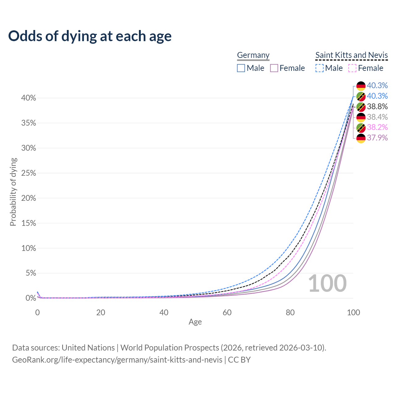 This life expectancy calculator shows the odds of living to 100, 95, 90, and below based on current age for both males and females in Germany and Saint Kitts and Nevis, along with mean and median age of death. The calculations are based on the 2026 life tables (actuarial tables) from the UN World Population Prospects.