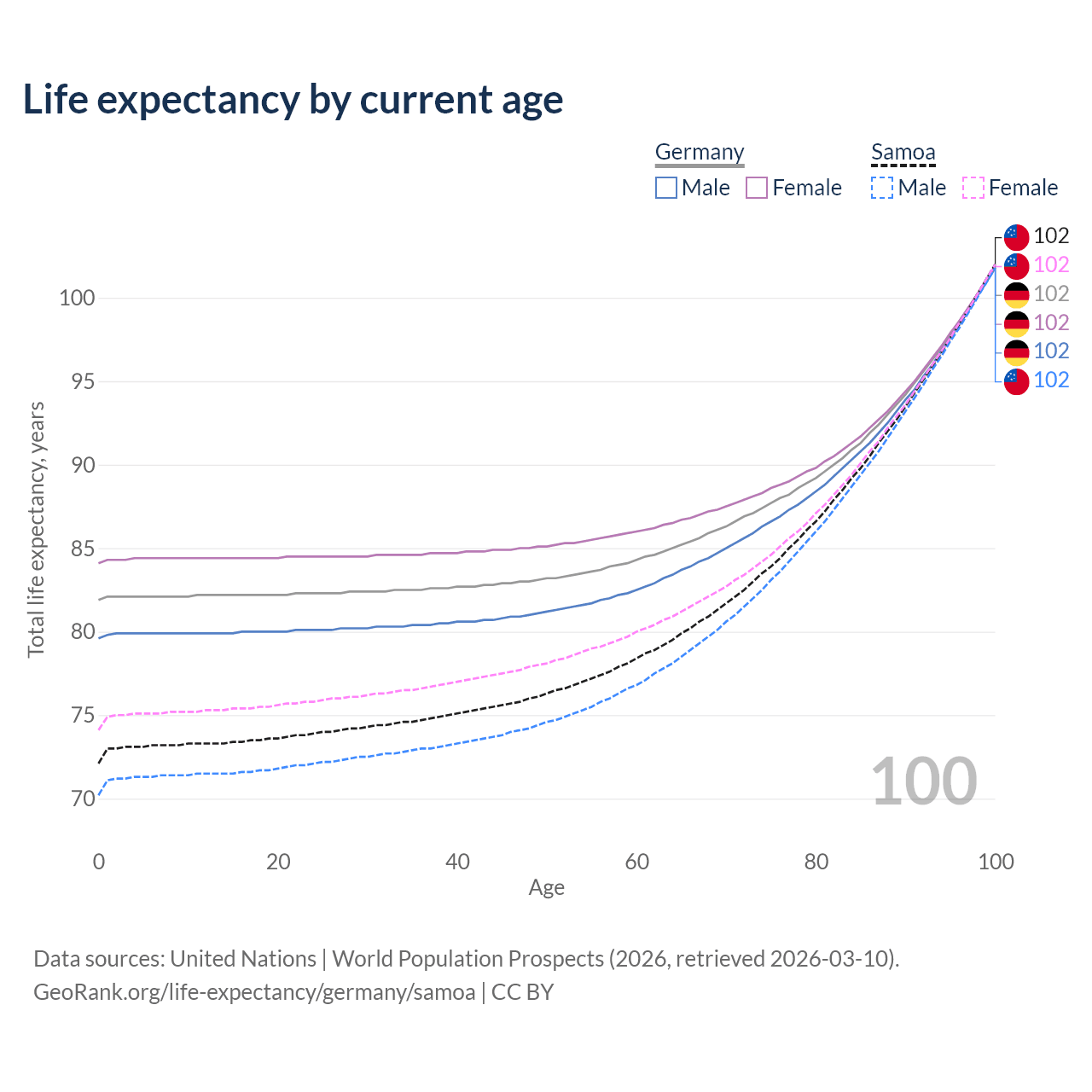 This life expectancy calculator shows the odds of living to 100, 95, 90, and below based on current age for both males and females in Germany and Samoa, along with mean and median age of death. The calculations are based on the 2026 life tables (actuarial tables) from the UN World Population Prospects.