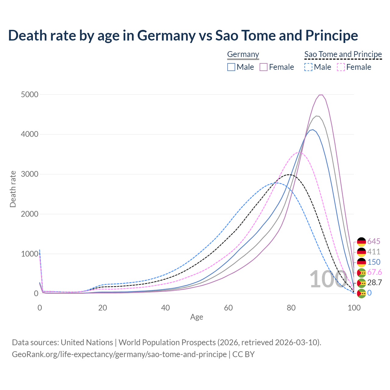 This life expectancy calculator shows the odds of living to 100, 95, 90, and below based on current age for both males and females in Germany and Sao Tome and Principe, along with mean and median age of death. The calculations are based on the 2026 life tables (actuarial tables) from the UN World Population Prospects.