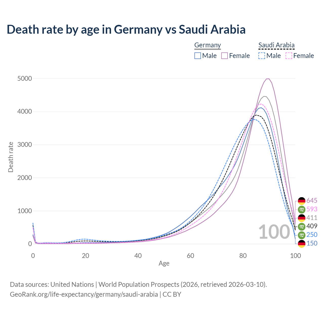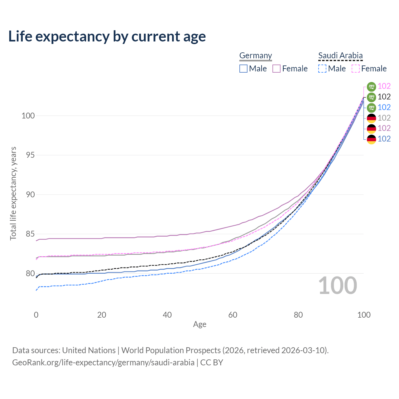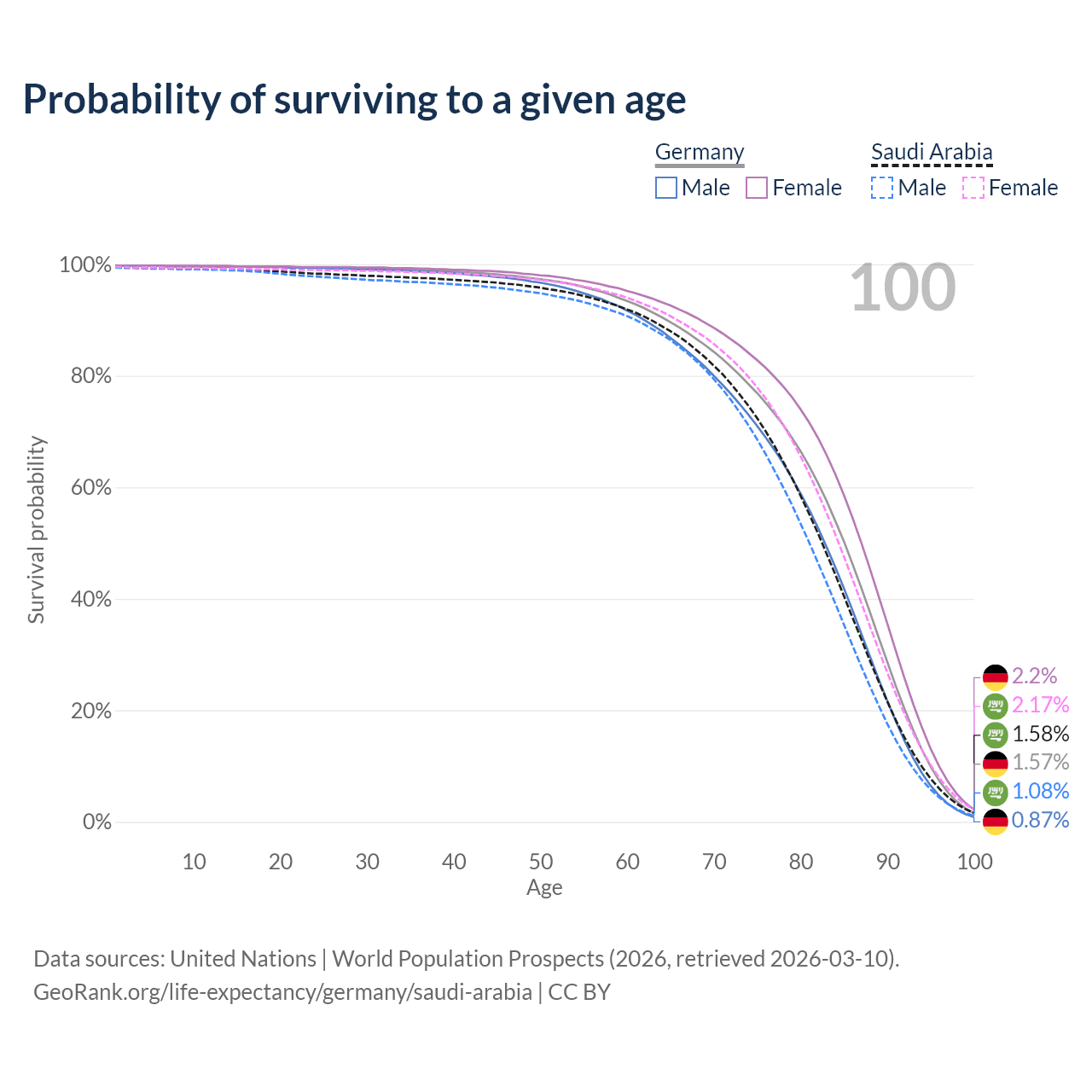 This life expectancy calculator shows the odds of living to 100, 95, 90, and below based on current age for both males and females in Germany and Saudi Arabia, along with mean and median age of death. The calculations are based on the 2026 life tables (actuarial tables) from the UN World Population Prospects.