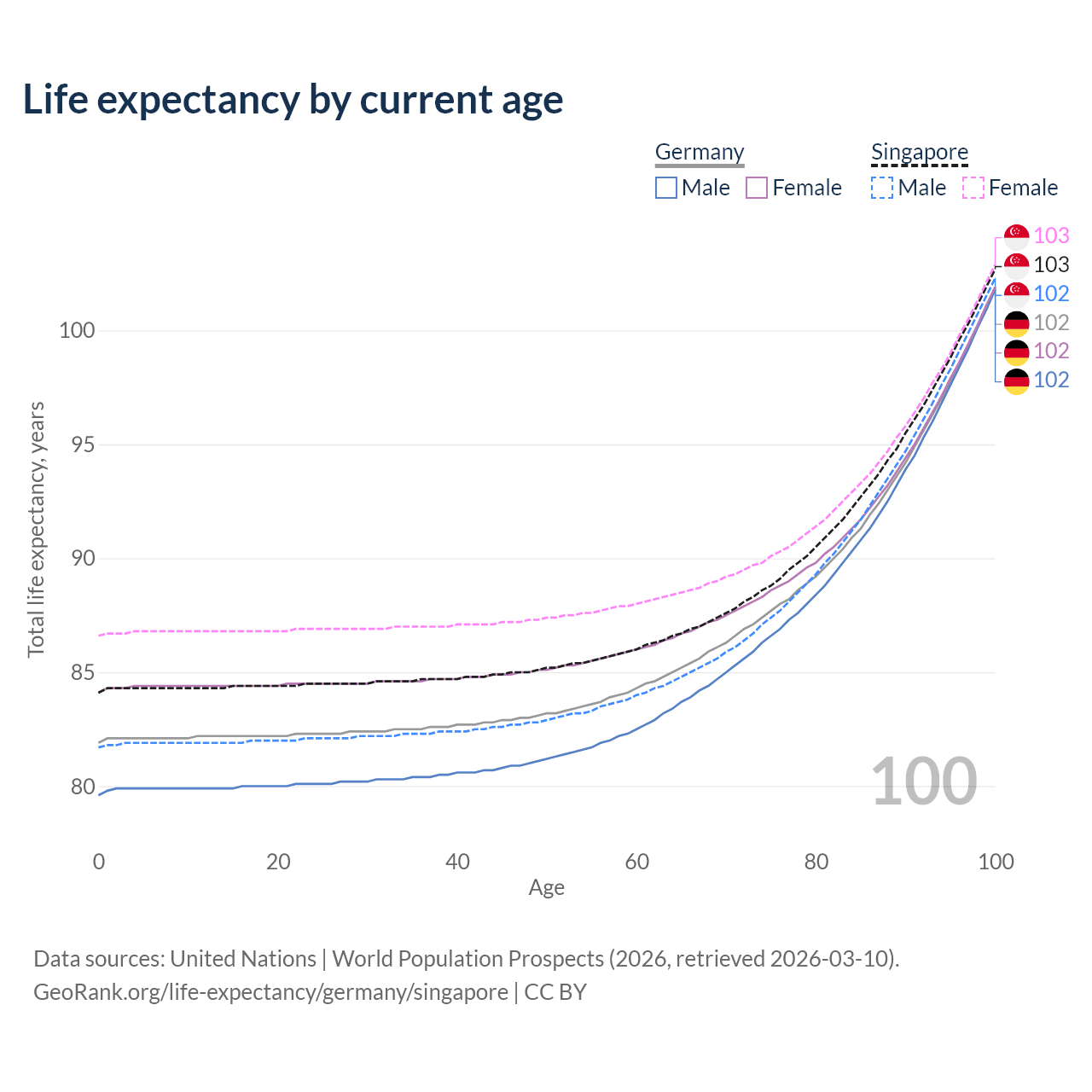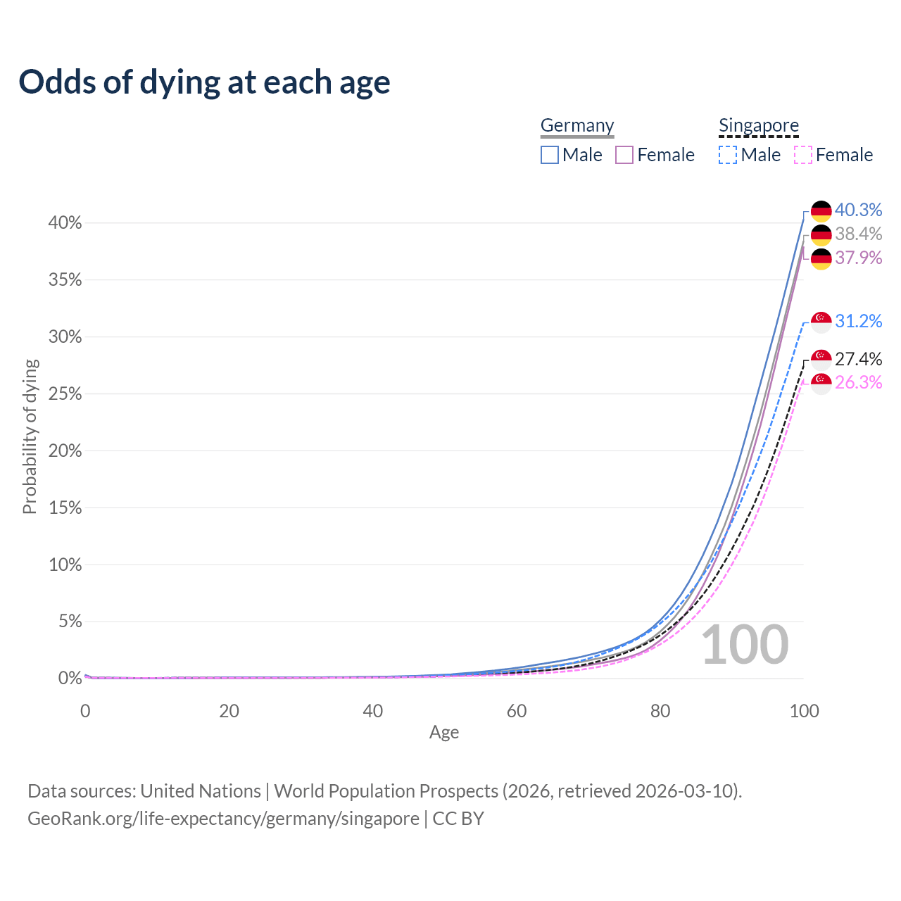 This life expectancy calculator shows the odds of living to 100, 95, 90, and below based on current age for both males and females in Germany and Singapore, along with mean and median age of death. The calculations are based on the 2026 life tables (actuarial tables) from the UN World Population Prospects.