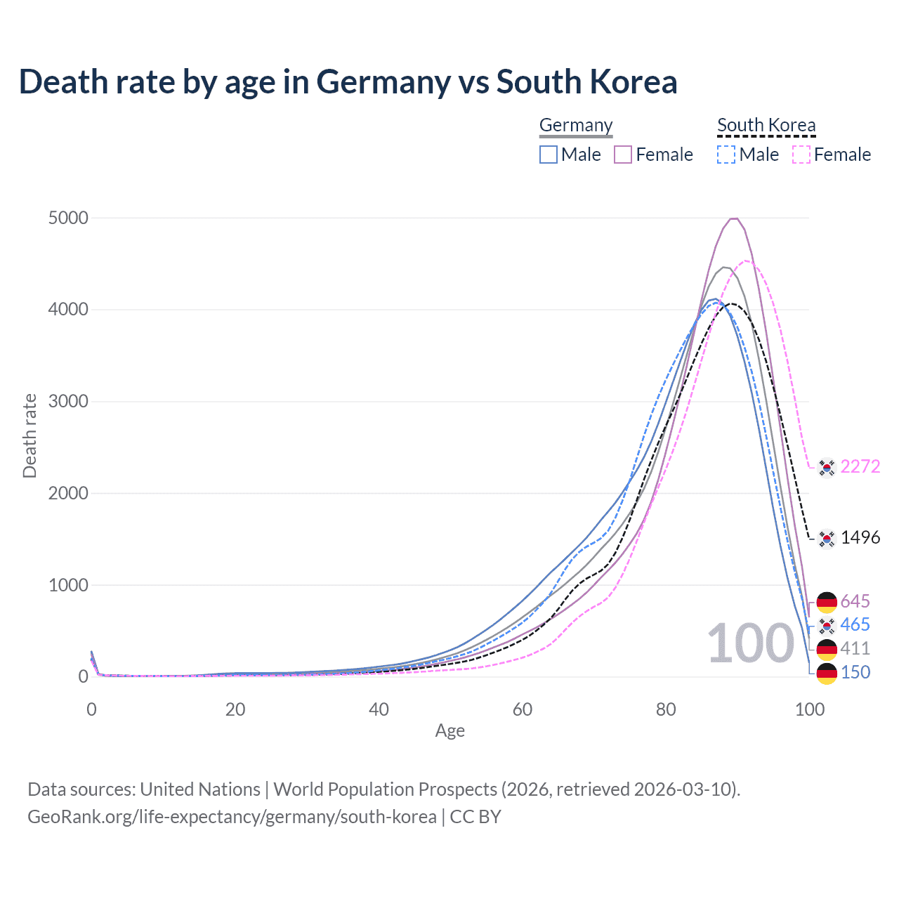 In Germany, the most common age of death is 88, compared to 89 in South Korea. The median age of death is 85.1 in Germany and 86.8 in South Korea, meaning only half of each cohort is expected to live past that age.