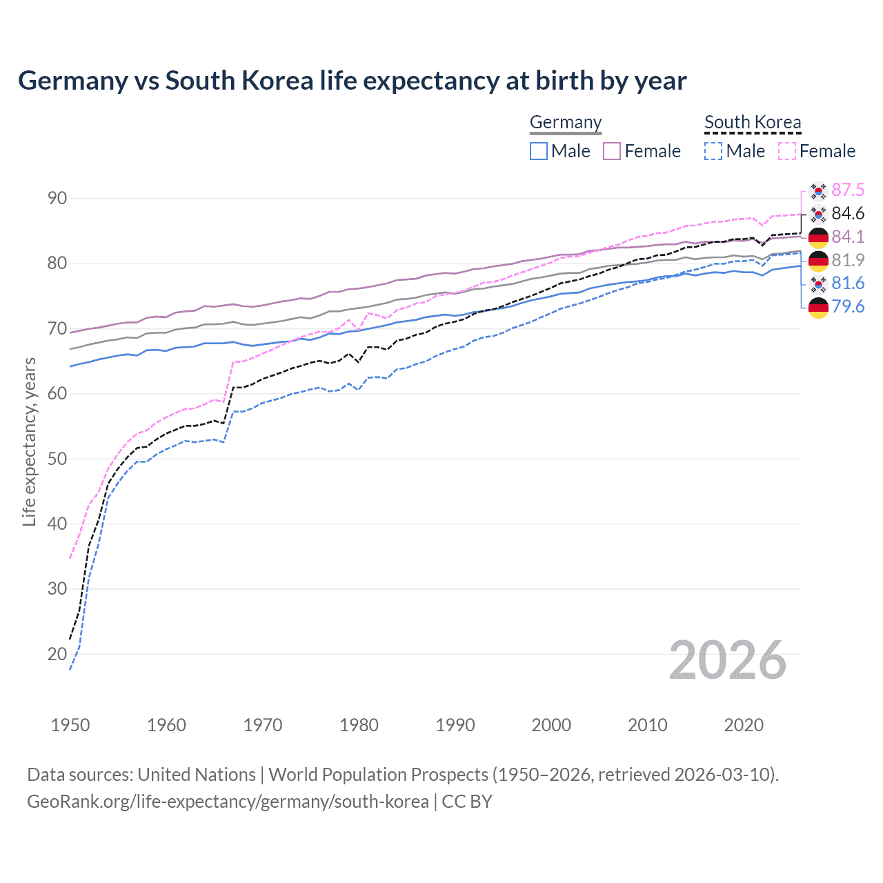 The average life expectancy at birth is 81.9 years in Germany vs 84.6 in South Korea. Germany is ranked 34/197 by life expectancy, and South Korea is 4/197. In Germany, the life expectancy is 79.6 years for males and 84.1 years for females. In South Korea, it's 81.6 years for males and 87.5 years for females.