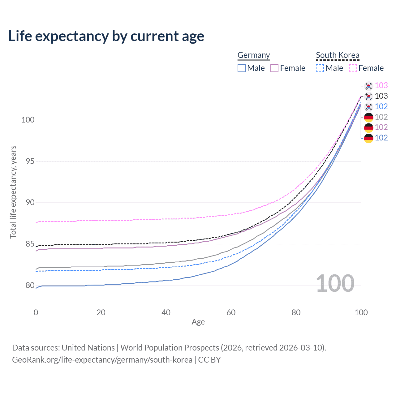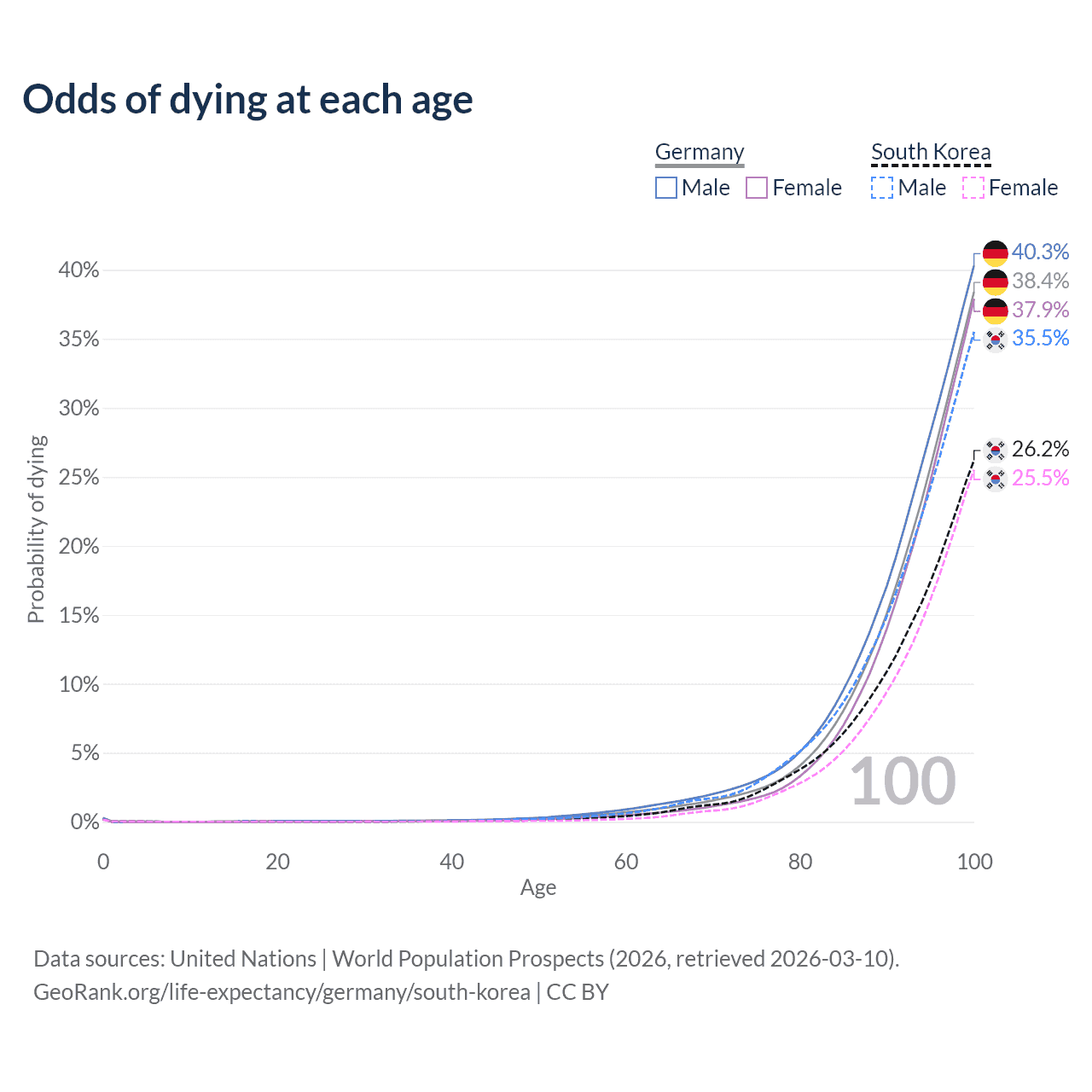 This life expectancy calculator shows the odds of living to 100, 95, 90, and below based on current age for both males and females in Germany and South Korea, along with mean and median age of death. The calculations are based on the 2026 life tables (actuarial tables) from the UN World Population Prospects.