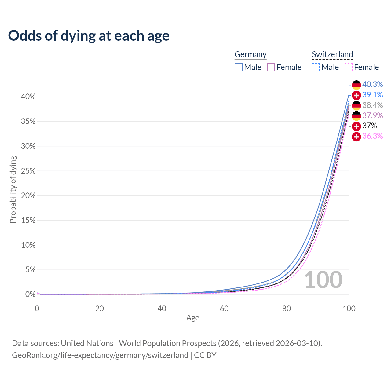 This life expectancy calculator shows the odds of living to 100, 95, 90, and below based on current age for both males and females in Germany and Switzerland, along with mean and median age of death. The calculations are based on the 2026 life tables (actuarial tables) from the UN World Population Prospects.