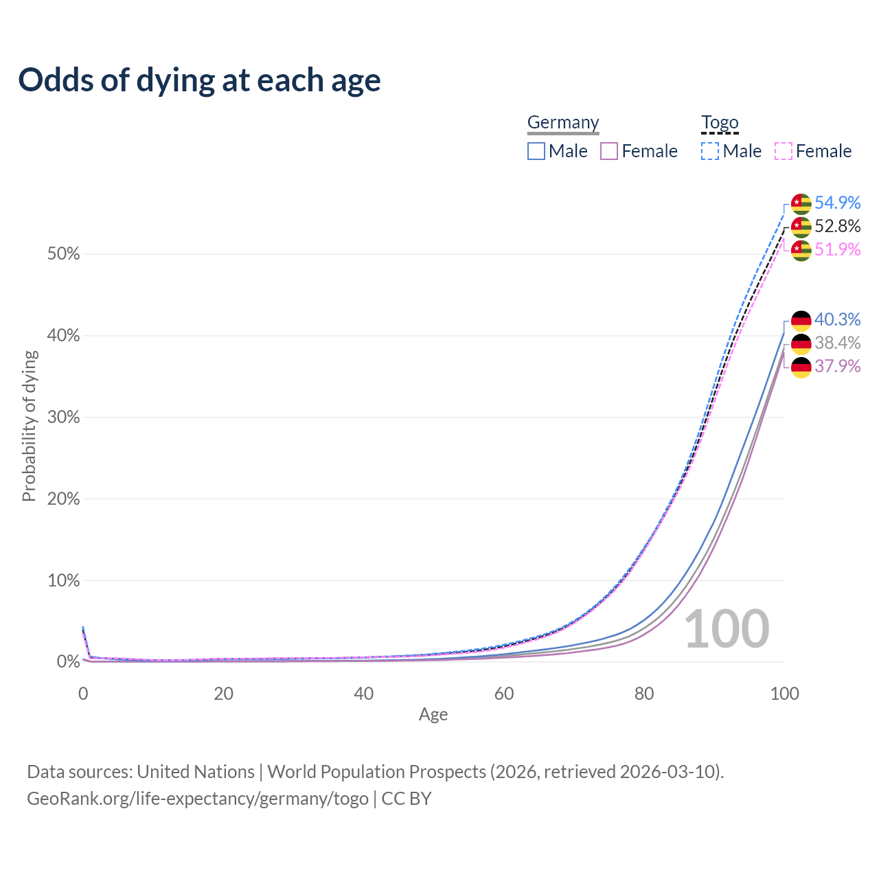 This life expectancy calculator shows the odds of living to 100, 95, 90, and below based on current age for both males and females in Germany and Togo, along with mean and median age of death. The calculations are based on the 2026 life tables (actuarial tables) from the UN World Population Prospects.