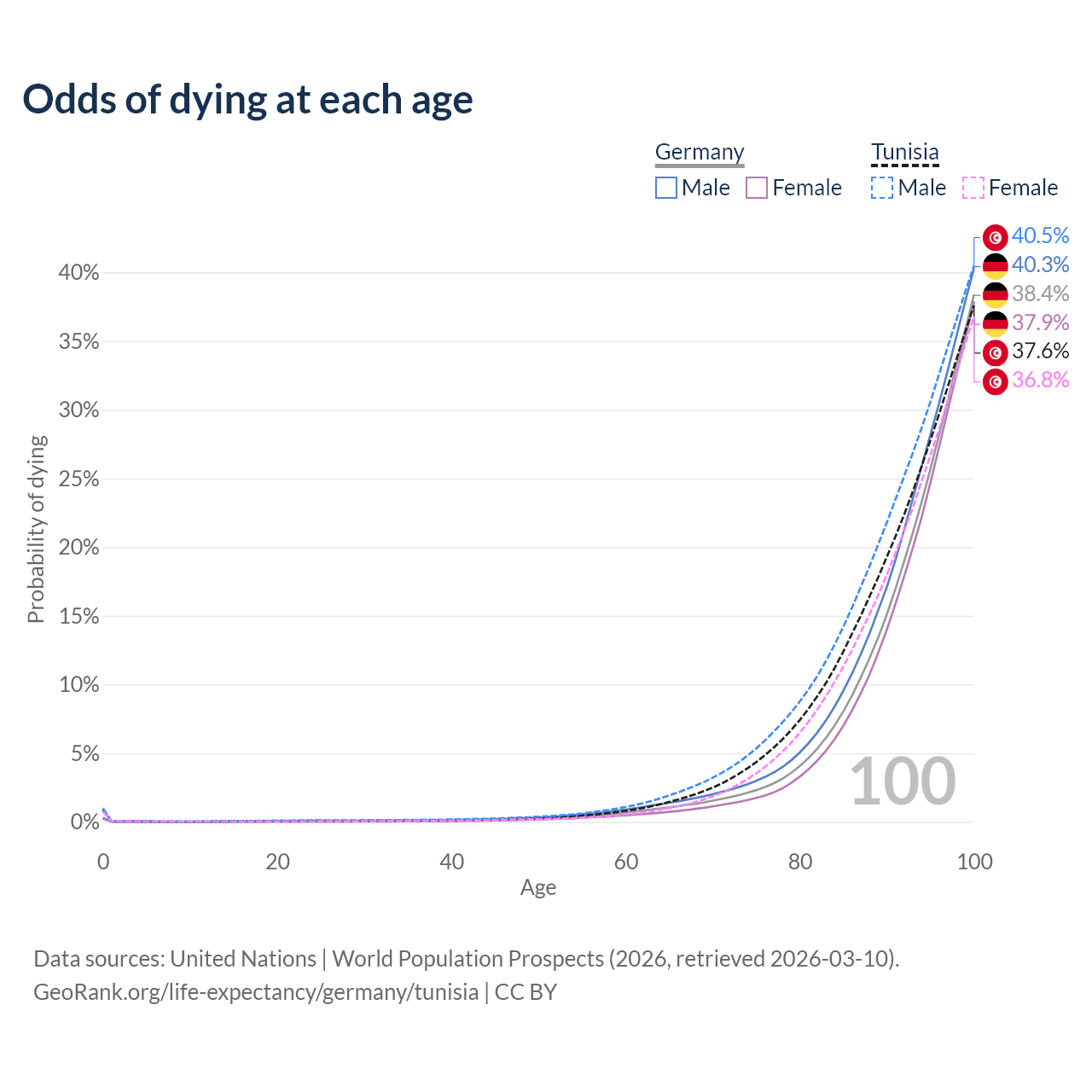 This life expectancy calculator shows the odds of living to 100, 95, 90, and below based on current age for both males and females in Germany and Tunisia, along with mean and median age of death. The calculations are based on the 2026 life tables (actuarial tables) from the UN World Population Prospects.