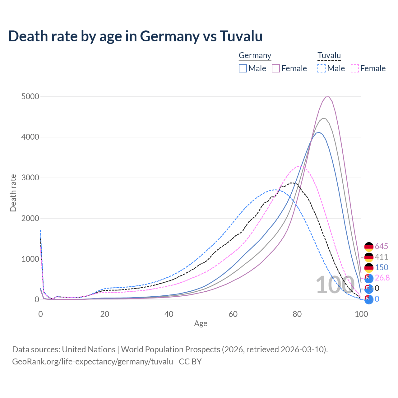 In Germany, the most common age of death is 88, compared to 78 in Tuvalu. The median age of death is 85.1 in Germany and 71.9 in Tuvalu, meaning only half of each cohort is expected to live past that age.