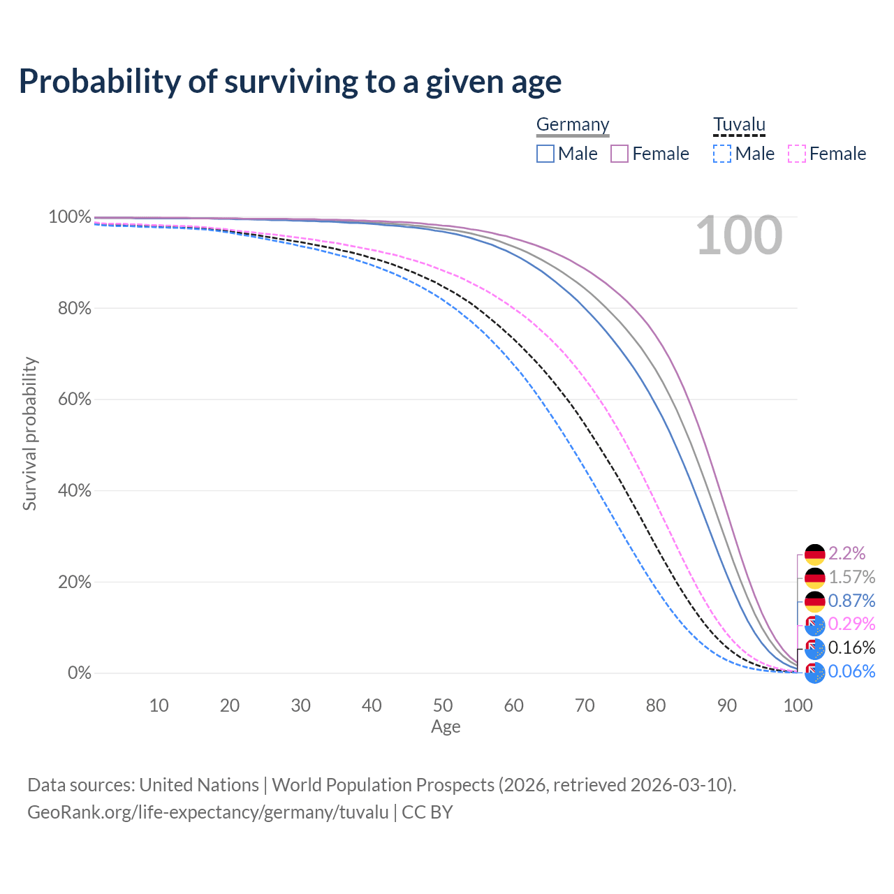 This life expectancy calculator shows the odds of living to 100, 95, 90, and below based on current age for both males and females in Germany and Tuvalu, along with mean and median age of death. The calculations are based on the 2026 life tables (actuarial tables) from the UN World Population Prospects.