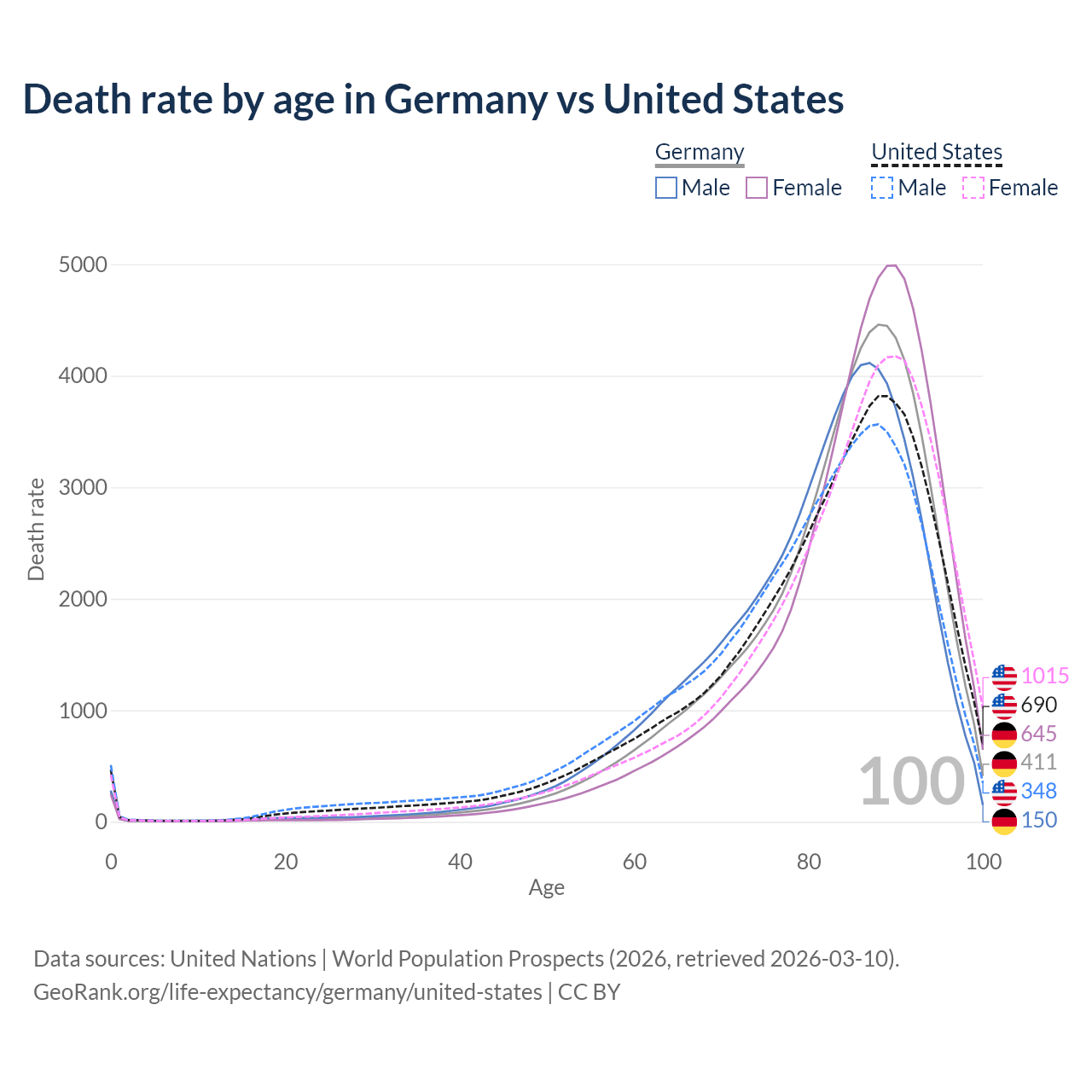 In Germany, the most common age of death is 88, compared to 89 in the United States. The median age of death is 85.1 in Germany and 83.9 in the United States, meaning only half of each cohort is expected to live past that age.