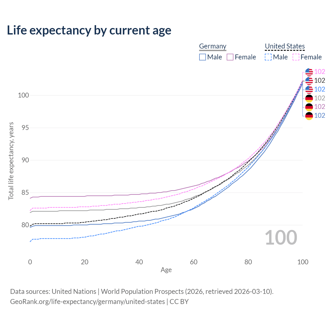 This life expectancy calculator shows the odds of living to 100, 95, 90, and below based on current age for both males and females in Germany and the United States, along with mean and median age of death. The calculations are based on the 2026 life tables (actuarial tables) from the UN World Population Prospects.