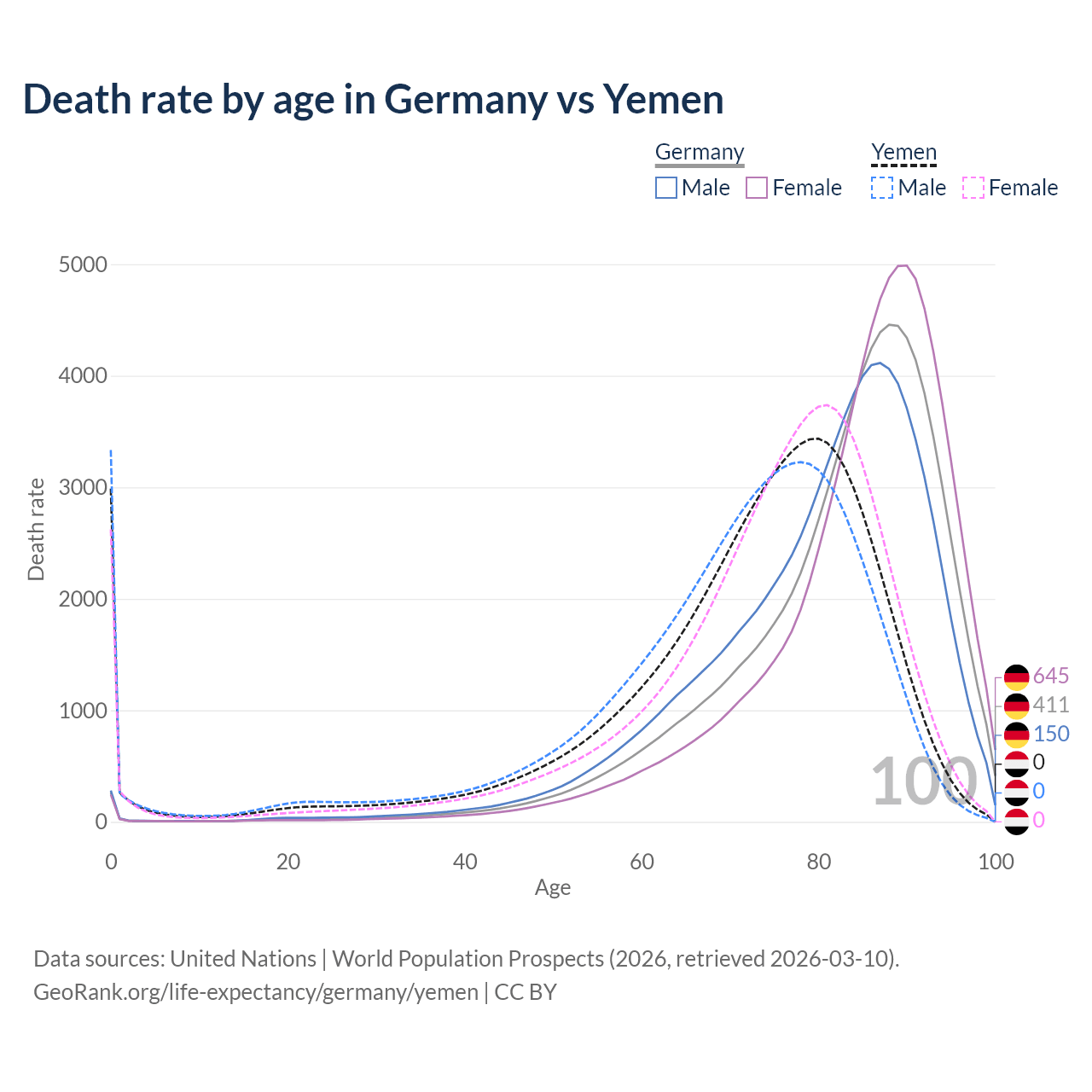 In Germany, the most common age of death is 88, compared to 80 in Yemen. The median age of death is 85.1 in Germany and 74.9 in Yemen, meaning only half of each cohort is expected to live past that age.
