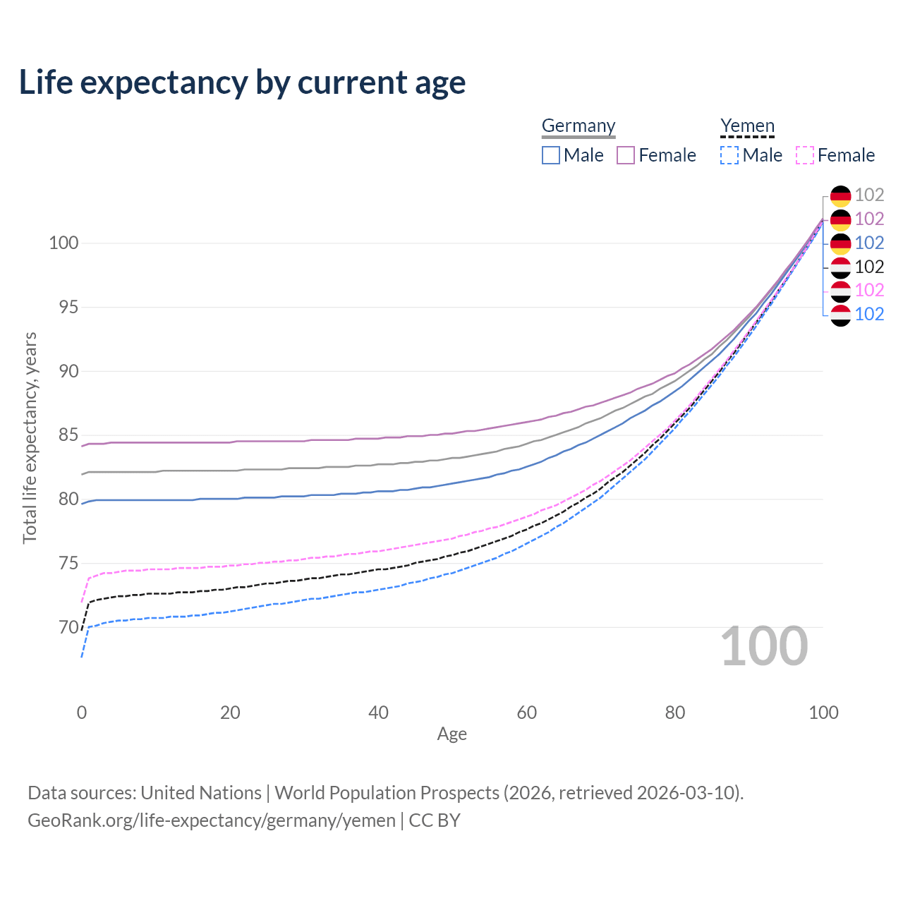 This life expectancy calculator shows the odds of living to 100, 95, 90, and below based on current age for both males and females in Germany and Yemen, along with mean and median age of death. The calculations are based on the 2026 life tables (actuarial tables) from the UN World Population Prospects.