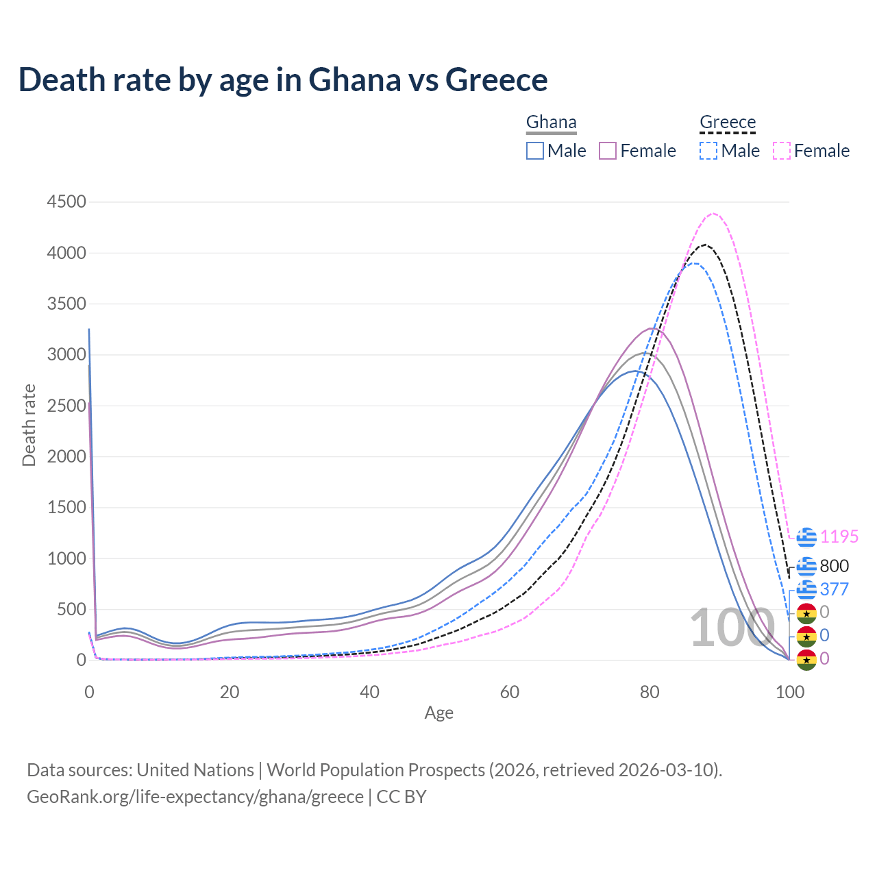 In Ghana, the most common age of death is 79, compared to 88 in Greece. The median age of death is 73 in Ghana and 84.9 in Greece, meaning only half of each cohort is expected to live past that age.